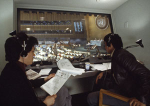 1983年,口译员陶见章和董叙林为联合国大会做同声传译。资料图