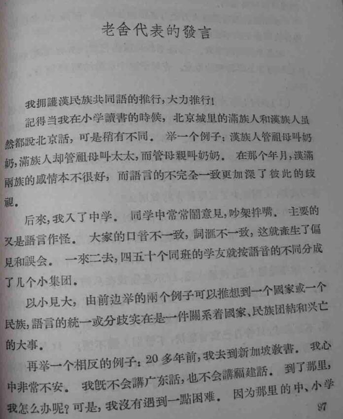 参加此次会议的代表,著名作家老舍讲到:自己上中学时,同班同学们口音不一,词汇各异,容易产生偏见和误会。一来二去,四五十个同班学友按语音的不同分成了几个小集团。以小见大,语言的统一或分歧,是一件关系着国家、民族团结和兴亡的大事。