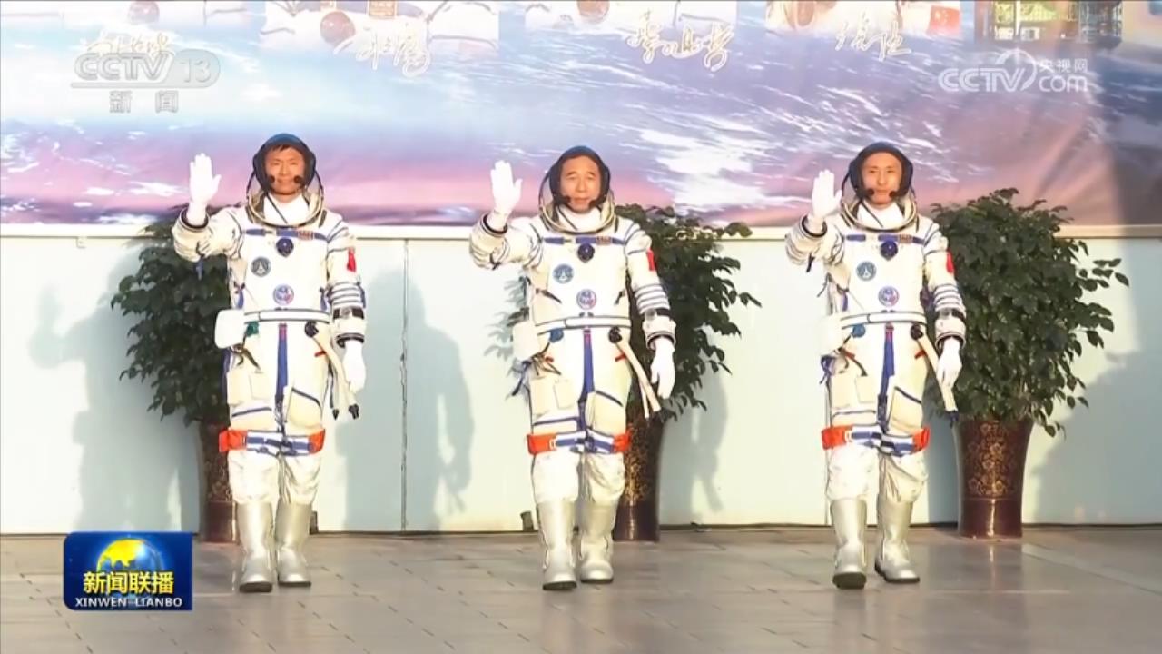 6时44分,景海鹏、朱杨柱、桂海潮三名航天员出征。