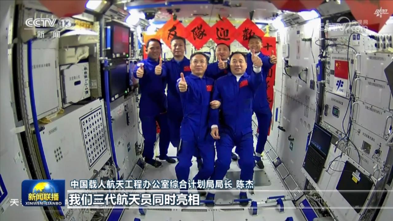 18时22分,神舟十五号航天员乘组顺利打开“家门”,欢迎远道而来的神舟十六号航天员乘组入驻“天宫”。