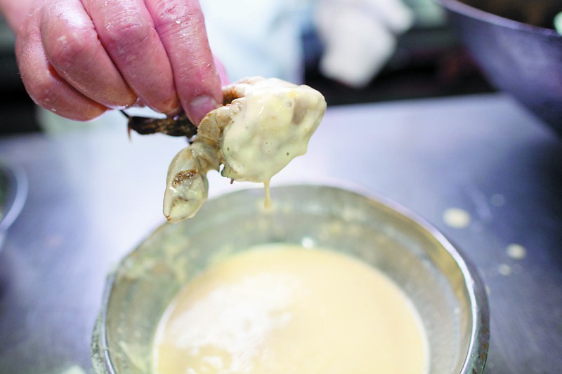 面拖蟹不一定要选个头大的,“袖珍”一点的更为鲜美,但小归小,必须活杀。洗净后的蟹搁在砧板上,八足朝天任其挣扎,趁蟹尚未翻身之际,拍刀腰斩。然后在面粉碗里重重一按,以阻止蟹黄的流失。