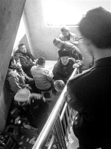 在锦博苑菜场,多人围坐在楼道口打牌,烟蒂满地。 /晨报记者 肖允