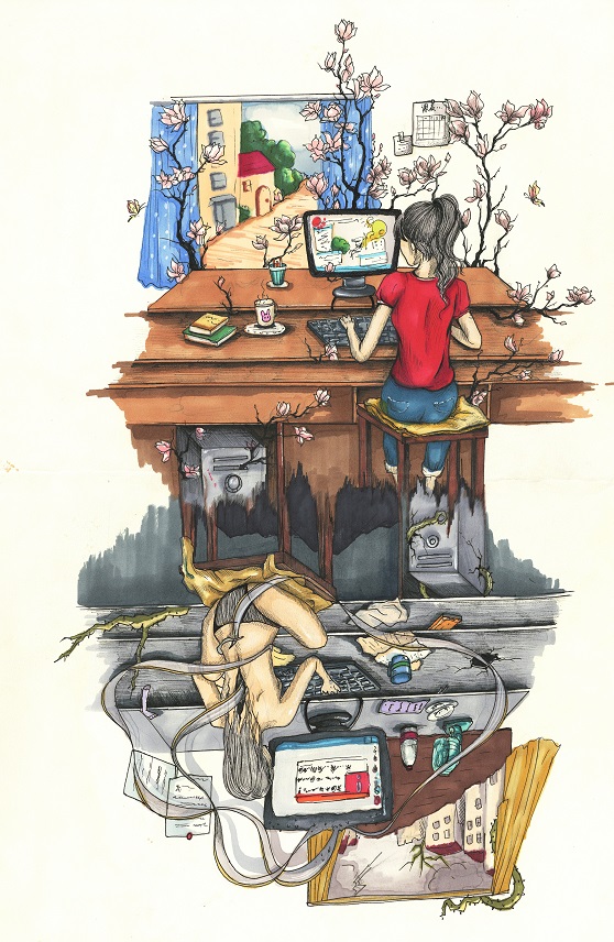 本漫画突出网络是把双刃剑的主题,运用对比和反转的构图形式,来展现文明上网的重要性,呼吁广大网民,文明上网,健康上网。由教育部思想政治工作司、中央网信办网络社会工作局联合主办,文汇报社承办的第四届“全国大学生网络文化节动漫作品征集”活动,自启动以来,受到全国高校和青年学子的积极响应,反响热烈,共收到来自全国28个省278所高校投稿作品978件,其中单幅插画作品426件,四格漫画作品269件,动画短片作品283件。