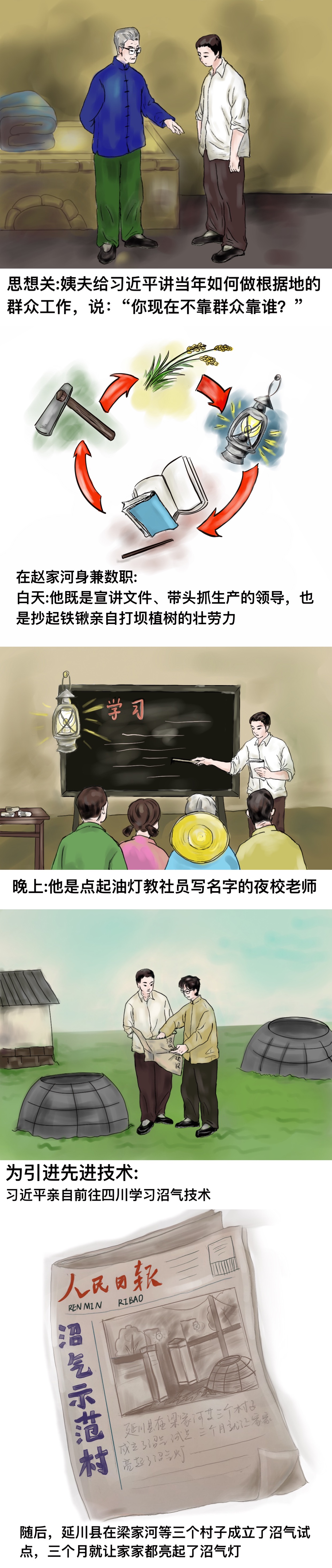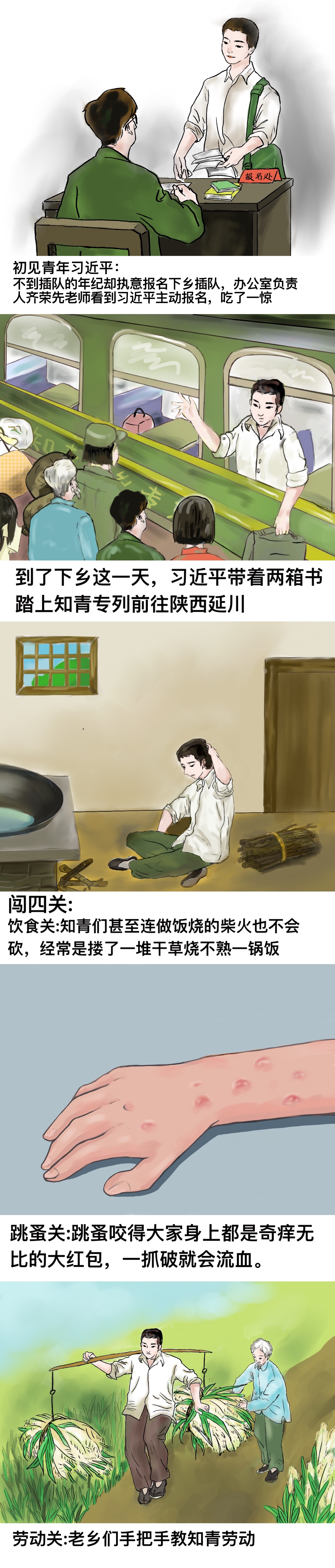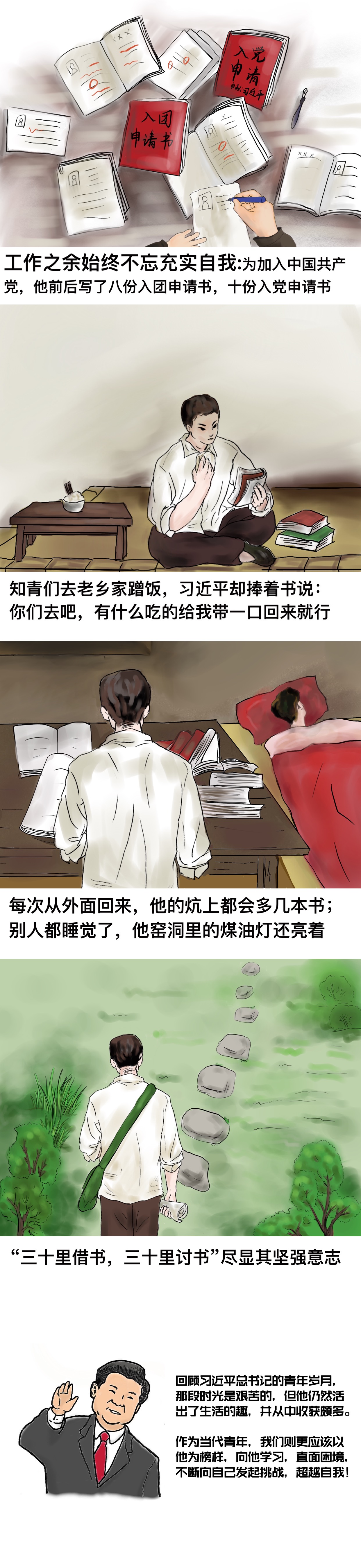 1969年1月,15岁的习近平来到陕西插队落户,开启了他长达七年的知青生涯,经过这样一段艰苦岁月的沉淀,“要为人民做实事”已经成为他心中不变的信念。本漫画借此创作,激励青年应该以习大大为榜样,坚定理想信念,布局艰难困苦,用青春之笔描绘祖国锦绣未来。