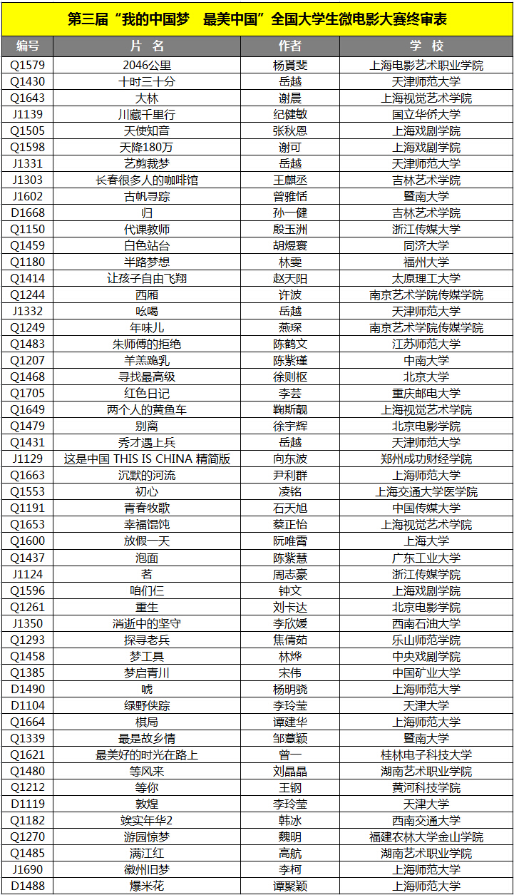 “我的中国梦·最美中国”全国大学生摄影及微电影创作大赛,是由教育部思政司和国信办网宣局指导,中国大学生在线、文汇报、人民网、易班网、湖南教育电视台、上海教育电视台主办,涉及面广、影响力大的全国性比赛。微电影大赛部分经过初审、终审等环节,已评选出以下51部入围作品(以作品名称笔划为序)。