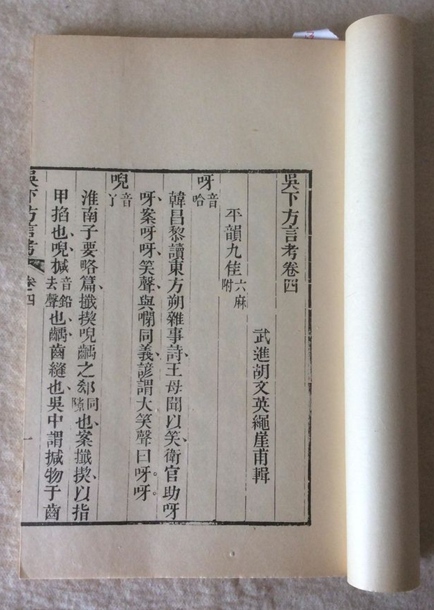 《吴下方言考》是清武进胡文英编著,此书搜集江南一带方言俗语,证以古训。有些我们少年时的习惯口语,我一直以为有音无字,只是口中说而无法用文字表达的,其实在古籍诗文中早就有。比如,问发生了什么事、某事怎么样了,无锡人就会问“那渹?”《吴下方言考》“那渹”条云:“渹音在亨秔之间。”此词出自《世说新语》刘真长(刘惔)见王丞相(王导),“那渹,犹如何也。吴中呼若何为那渹。”又例如孩童嬉戏打闹,搔人痒处,也是我一直以为有音无字的,该书字条“欨(世+欠)”(音呼痴)谓:“欨(世+欠),以手痒人颈而使笑。吴中曰欨((世+欠))。”(音呼痴痴)再如“洵”,“北音省,吴音读若很。”“案洵,使涕出也。吴中谓手捻鼻出涕曰洵。”如此等等,不一而足。