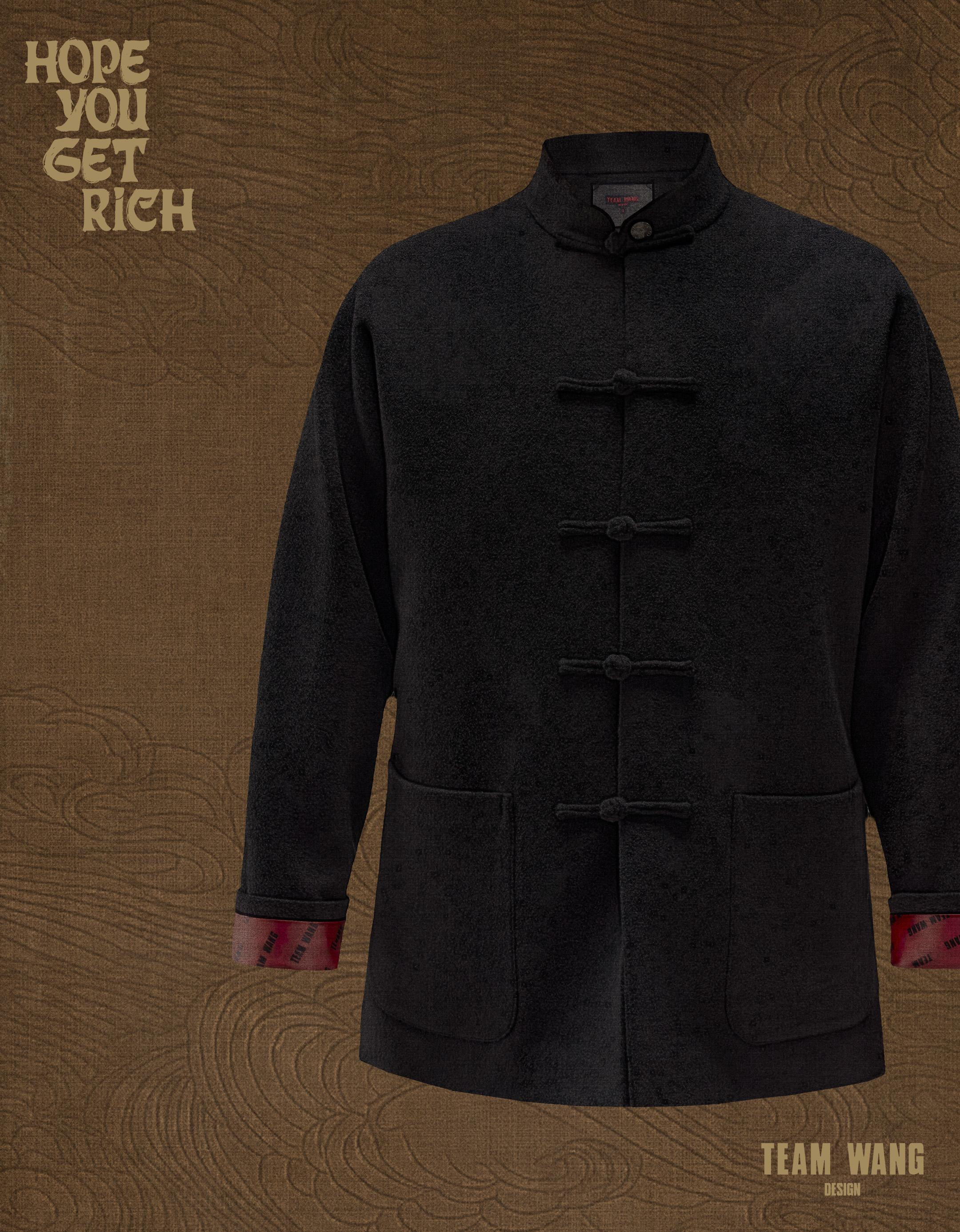 此次“HOPE YOU GET RICH”龙年限定唐装围绕中国传统服饰 - 唐装为设计蓝本,在材质、细节等处注入TEAM WANG design品牌 DNA进行呈现。充分考虑到季节因素,材质方面选择100%含量上乘羊毛呢面料进行打造,提高其保暖性能;设计方面,在保持品牌一贯极简风格的基础上,融入其标志性的EYELET气眼、金属LOGO牌等元素加以点缀,凸显品牌独特辨识度的同时亦能满足日常穿搭需求;内里则采用品牌经典LOGO图案辅以撞色系进行吸睛搭配,别具型格。