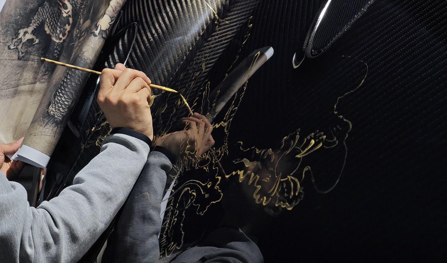 收到上海博物馆馆方的一个创作任务,是要在“行云流水——从达•芬奇到帕加尼Utopia”展览展出的一个意大利超跑车引擎盖上画一条中国龙。