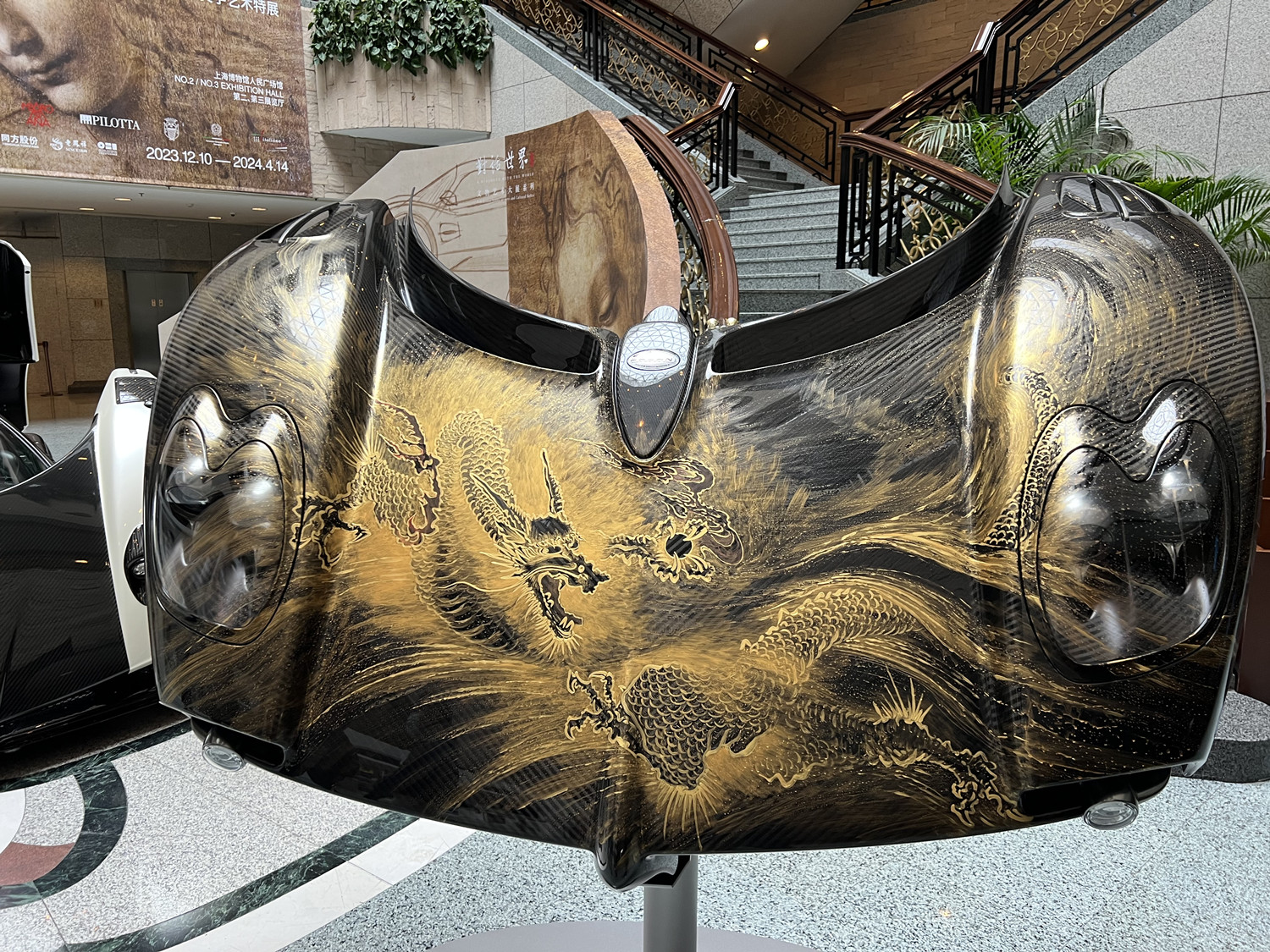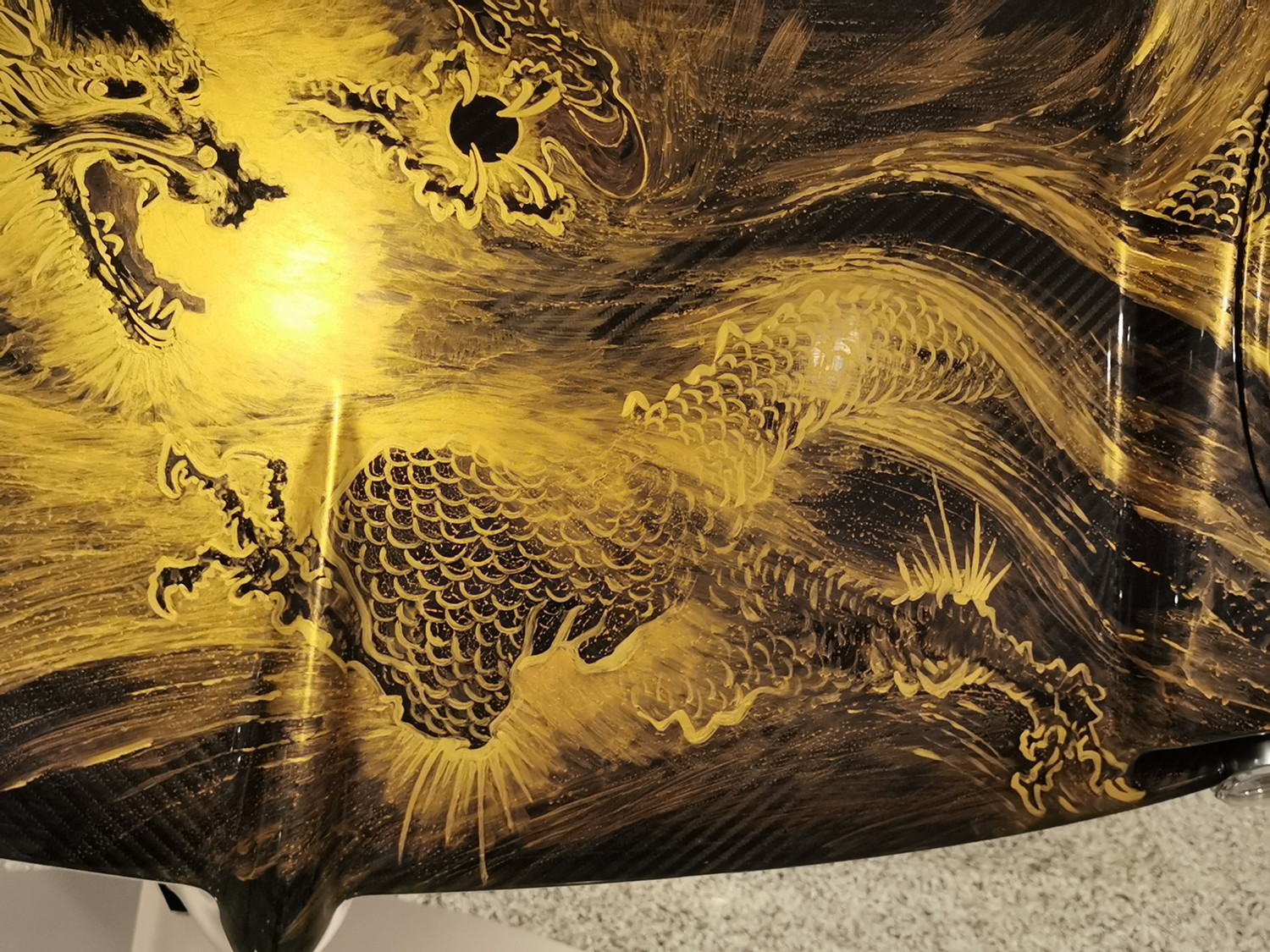 2024年3月1日,终于在上海博物馆人民广场馆目前空置的最大的一号展厅见到这个Utopia引擎盖。我慢慢欣赏它的每一个细节,不禁赞叹这不是工业产品,而是一件艺术品。后来帕加尼先生告诉我,这个引擎盖需要四个巧手女工用四天时间全手工制作。它的烤漆是黑色,斜向分布着一道道暗灰色花纹,给人一种蟒蛇皮的质感。这个颜色,肯定不能用传统中国画的水墨来表现,而是让我联想起在磁青纸上用金银粉作画。因此,直觉告诉我画一条金龙才是最佳的。