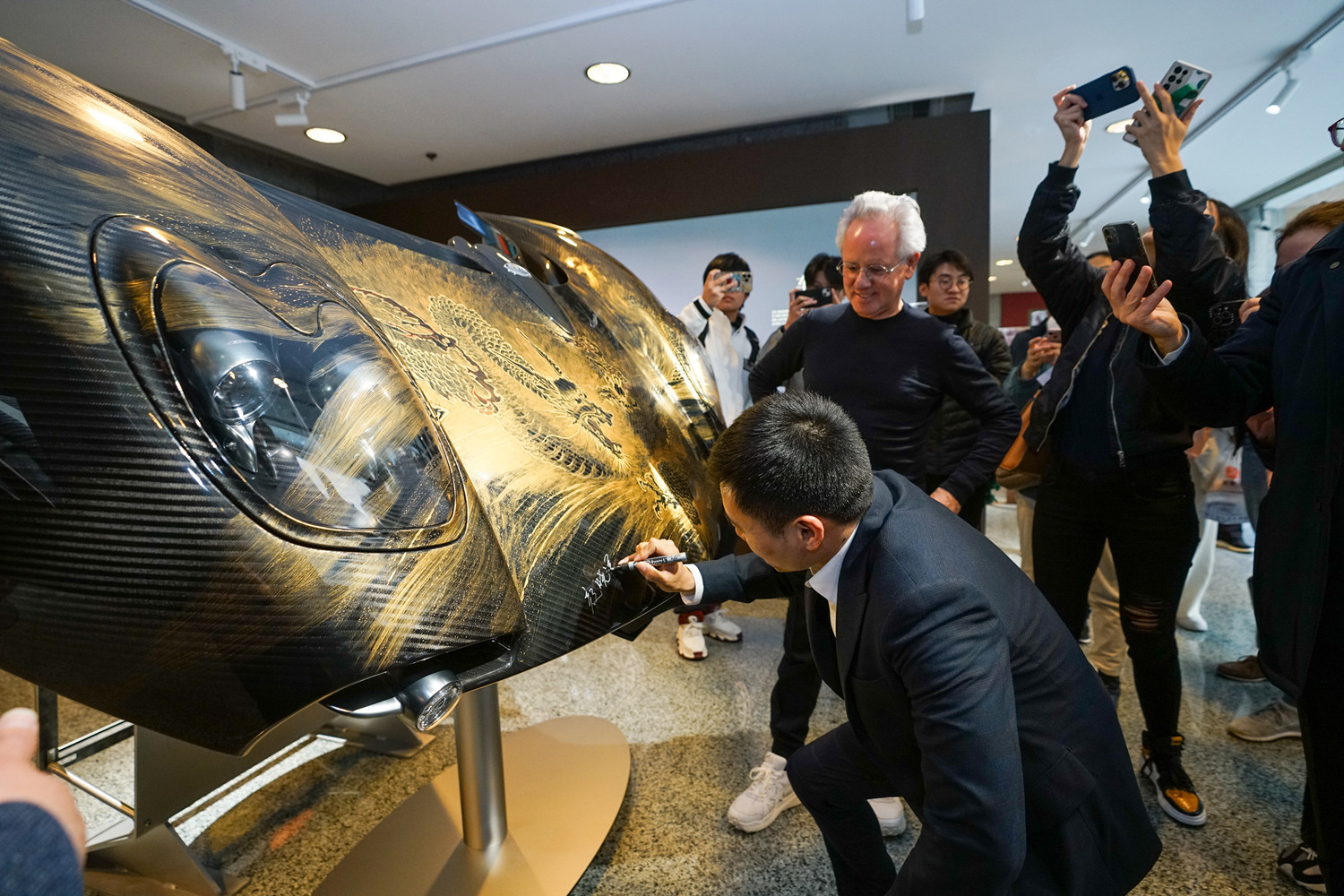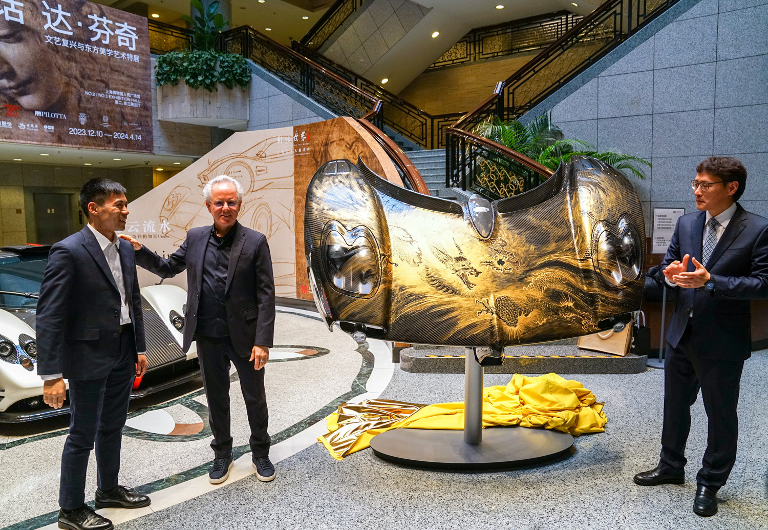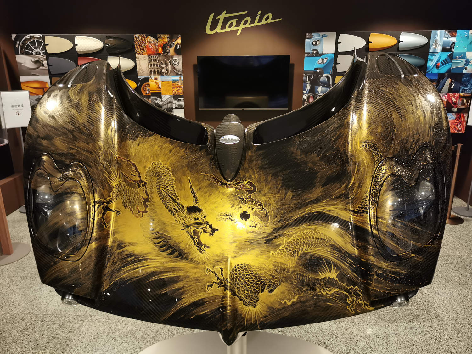 近日上海博物馆大堂迎来“对话达·芬奇——文艺复兴与东方美学艺术特展”的彩蛋活动——“行云流水——从达•芬奇到帕加尼Utopia” 限时专题展览,用艺术对话科技。上海博物馆书画部副研究馆员颜晓军获邀在第三代Utopia的引擎盖上绘制一幅中国龙。