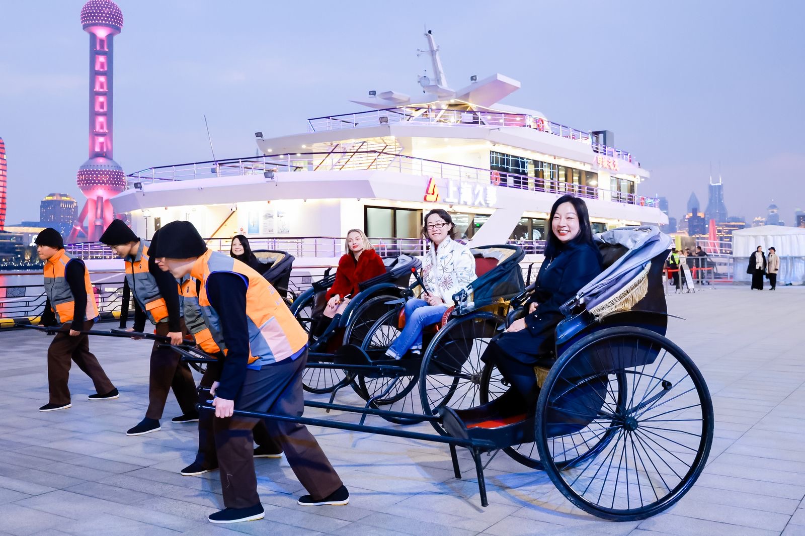 女神节当晚,市民游客们在北外滩国客中心登上了上海浦江游览集团有限公司旗下的五星级游船“申城之光”轮,不同于去年的活动,升级版的江畔微醺派对2.0从一开始就给到了他们不一样的感受,游客们来到码头后,首先映入眼帘的便是一辆辆老上海复古黄包车,车夫等待着游客们的到来,将他们一一拉到了登船口,仿佛回到那个坐黄包车去黄浦江坐船的年代。
