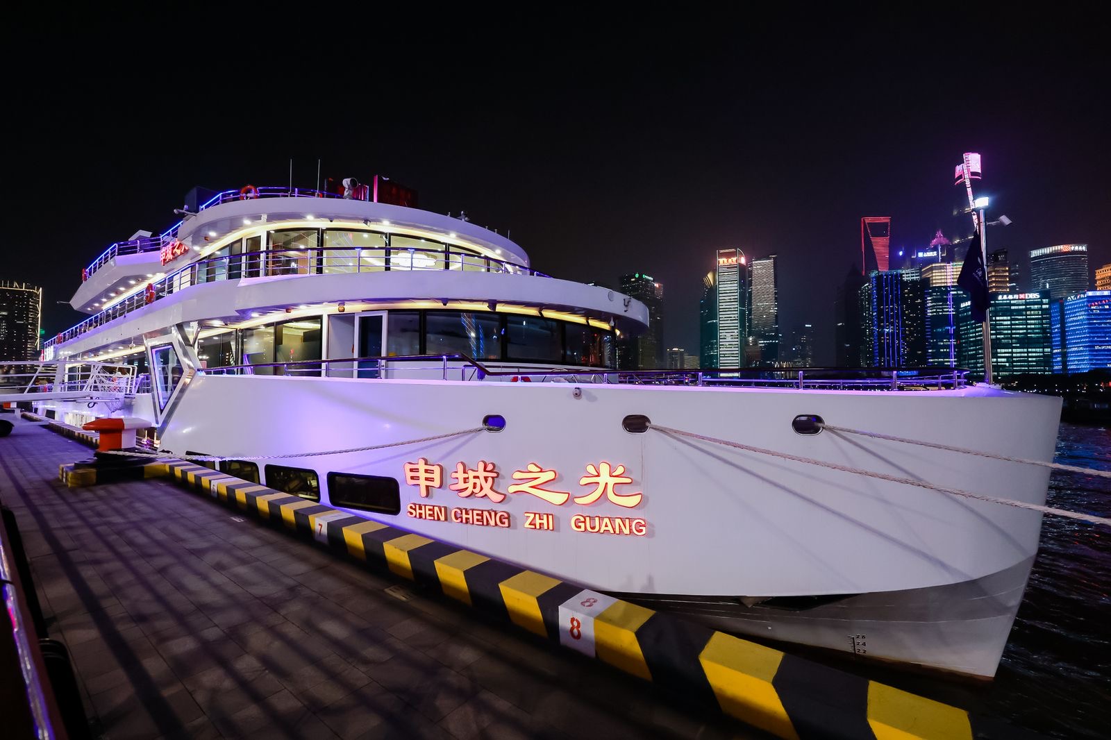 而市民游客们乘坐的“申城之光”轮,是新一代黄浦江游览船,集商务接待、大型会议、大型庆典或展示、新闻发布、观光游览、休闲娱乐宴会等为一体。全船共4层,长62.3米,型宽15.1米,最大载客400人,拥有观光大平台,游客可居高观赏黄浦江两岸风光。“申城之光”在设计上充分汲取了大型游艇的现代视觉美感,采用极简主义设计手法,用最简练的线条描绘出端庄大气的外观。室内空间灵动且富有变化,呈现出通透效果,让游客得以和黄浦江亲密接触。