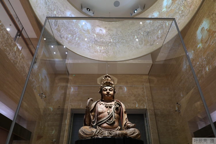在一楼至二楼衔接处,是一处层高近8米的独立空间。中心位置,金代漆金彩绘木大势至菩萨像端坐高台上,其头顶悬挂着环形幕帘,相似风格的壁画投影其上,缓缓转动,光影透至四周墙壁,影影绰绰,令人沉浸其中。这尊体量巨大的木雕源自山西南部汾河流域。金、元时期,该地区木雕造像繁盛,艺术造诣高超,其样式影响了当地元、明时期寺庙壁画,充分体现了中国古代艺术“绘塑并举”的特征。