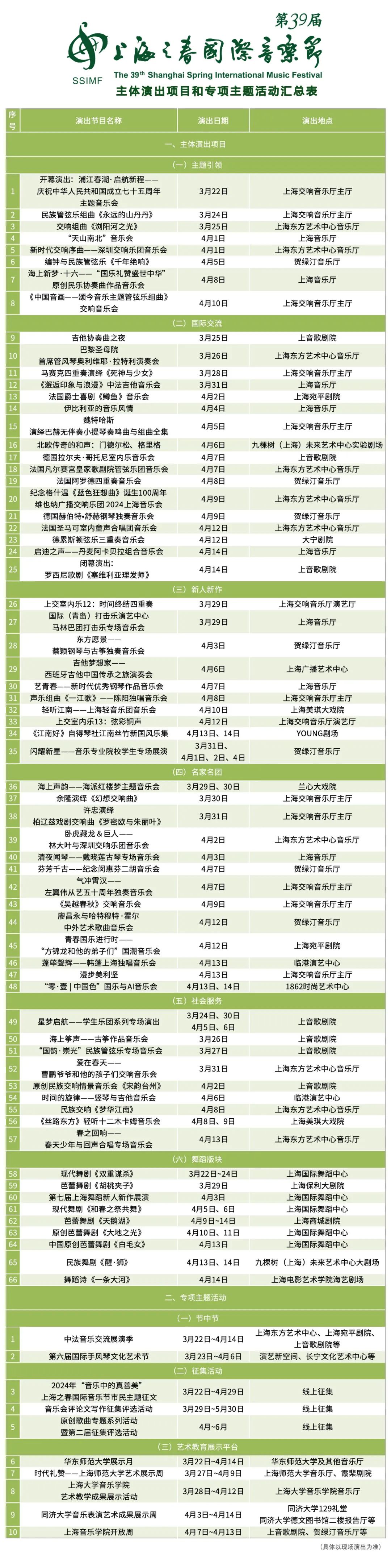整个音乐节期间,将举办66台主体演出,其中包括57台音乐演出、9台舞蹈演出。此外,还将举行10项专项主题活动,包括2项节中节、3项征集活动、5项教育成果展示及丰富多彩的展演活动。一起来看看吧↓↓