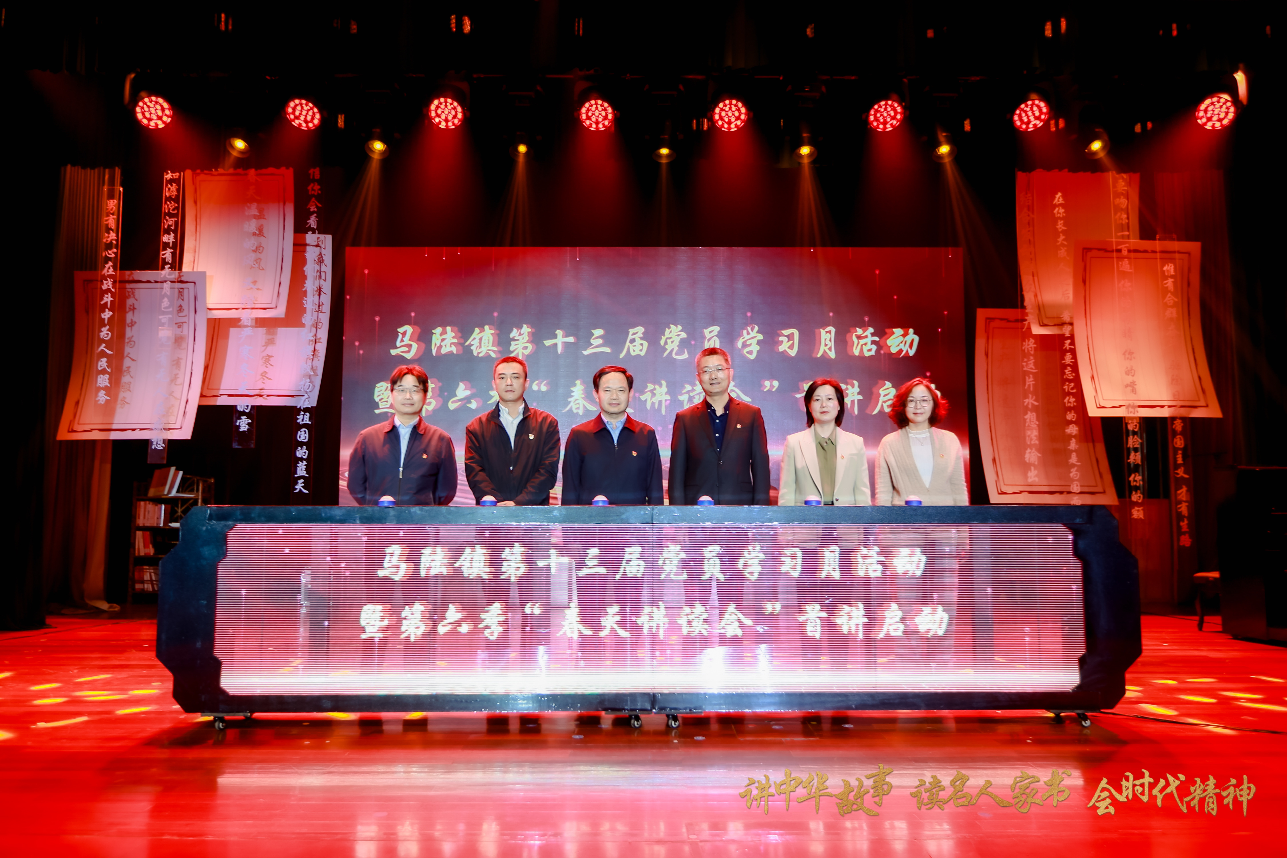 4月23日下午,以“讲中华故事 读名人家书 会时代精神”为主题的马陆镇第十三届党员学习月开幕式暨第六季“春天讲读会”首讲在马陆文体中心剧场举行。区委宣传部副部长、区委网信办主任石中军,嘉定区文化和旅游局党组书记夏峰,马陆镇党委副书记、镇长叶蓉,嘉定区融媒体中心党委书记、主任邵钧,马陆镇人大主席肖拥军共同启动马陆镇第十三届党员学习月活动暨第六季“春天讲读会”首讲。