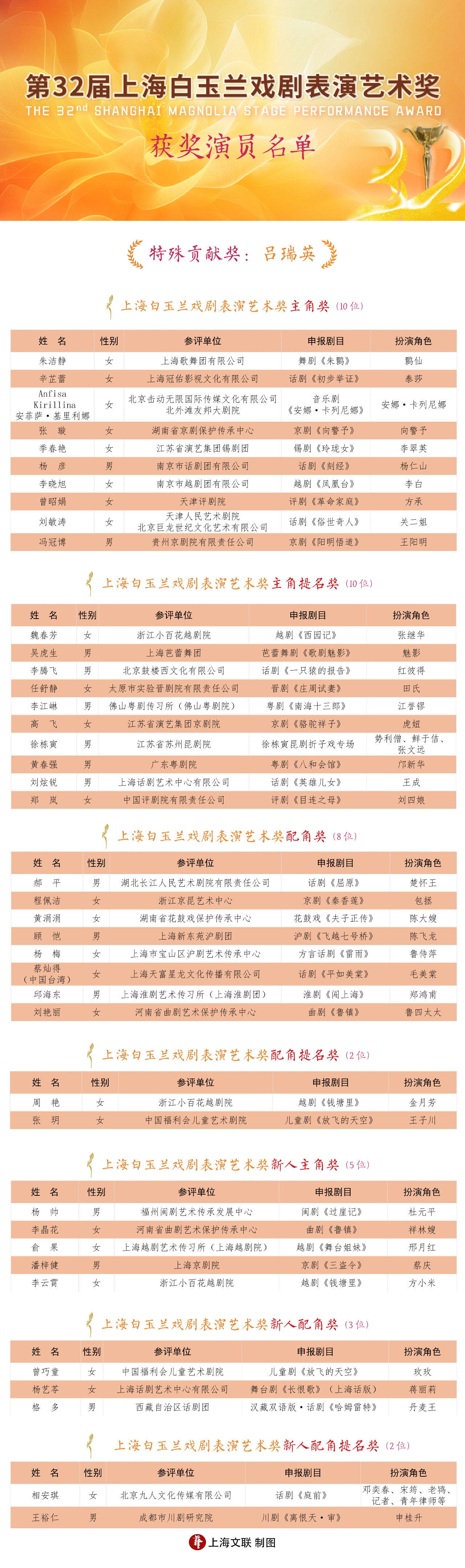 “白玉兰花开,白玉兰花开,圣洁的光辉,照映乾坤。”《白玉兰之歌》再度响起。今晚,第32届上海白玉兰戏剧表演艺术奖颁奖晚会在上海文化广场举行。本届白玉兰戏剧奖颁奖晚会以“花开白玉兰·绽放新时代”为主题,著名表演艺术家一一揭晓获奖演员名单并为获奖演员颁奖,来自全国各地的艺术家欢聚一堂,共同见证本届白玉兰戏剧奖颁奖盛况。