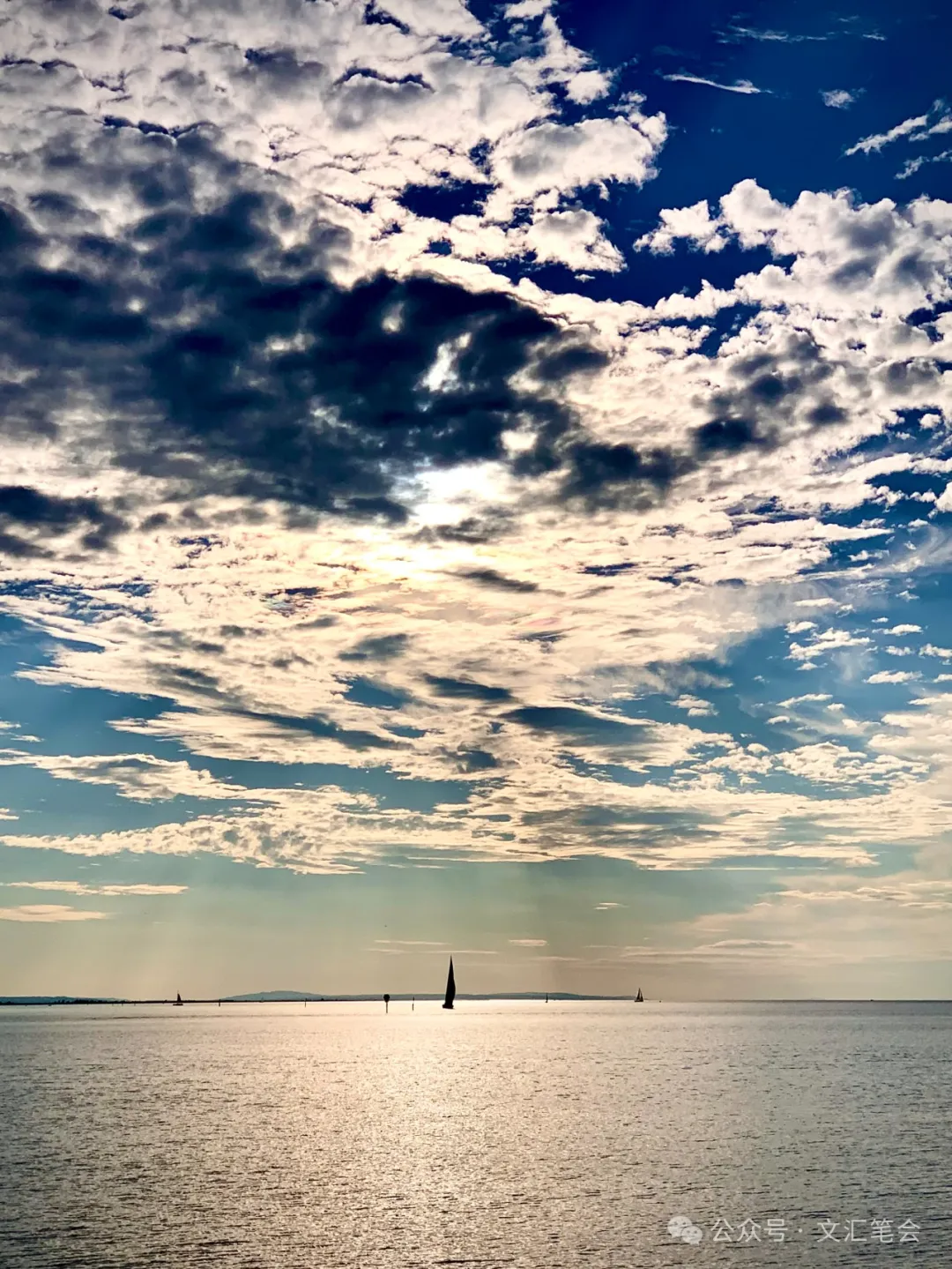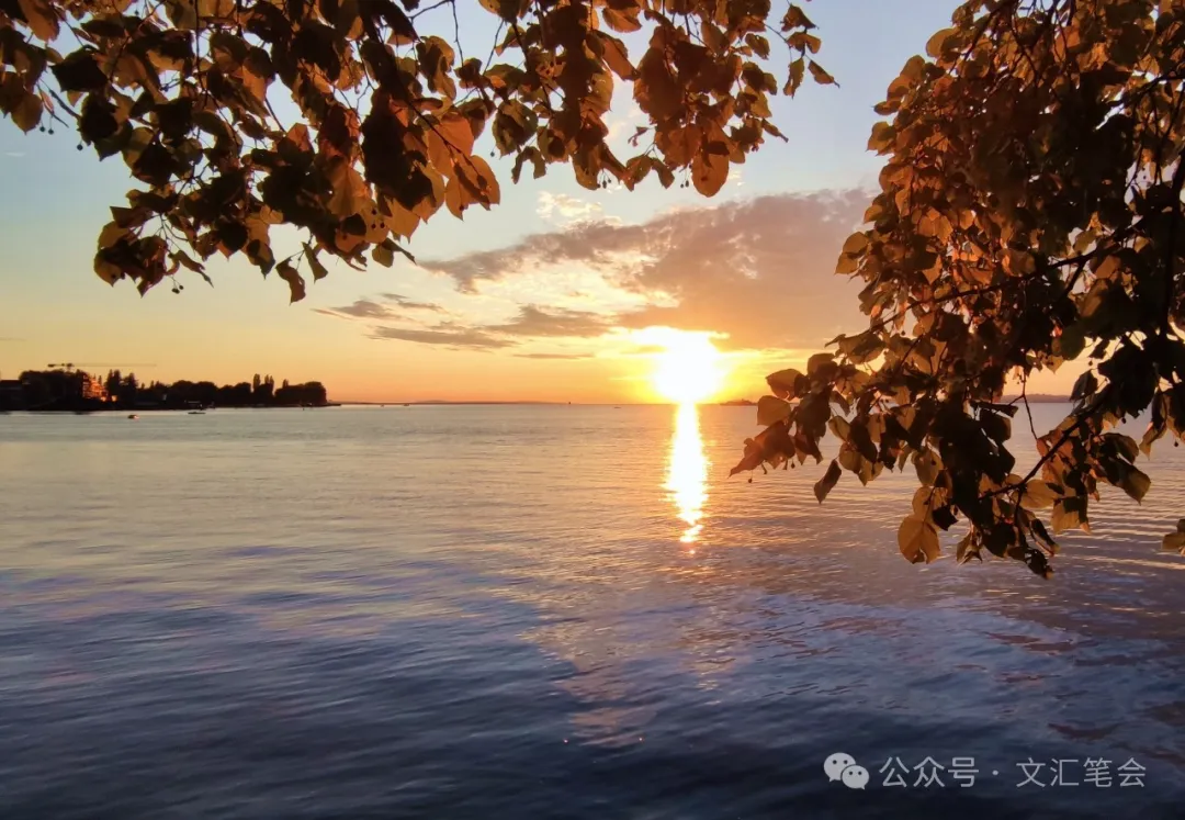 湖面上暮云四合,一片灰蓝色的斑斓。太阳时不时从厚厚的云层里探露出脑袋,把它灿烂的喜悦洒满湖面。满湖摇曳着万道金辉,有帆船或游轮从湖面轻轻掠过,像在洒满碎金的丝缎上滑翔,简直宛如神话世界。渐渐地,天色由灰蓝变为金黄,湖面也随之应和,天地万物都宛如镶了一圈金边。游客静坐在长椅、台阶、堤坝、草坪上,眺望云蒸霞蔚、落日熔金。天上的云彩像万花筒一样,变幻着各种形状和色彩,又在辽阔的湖面投射出各种光影效果。我们忘却了今夕是何年,此身在何处,浸淫在湖天一色中,除了赞叹大自然的鬼斧神工,夫复何言。落日最后以很快的速度沉沦下去,西方一片霞红,终于归于黑暗。四周已华灯绽放,我如梦初醒。