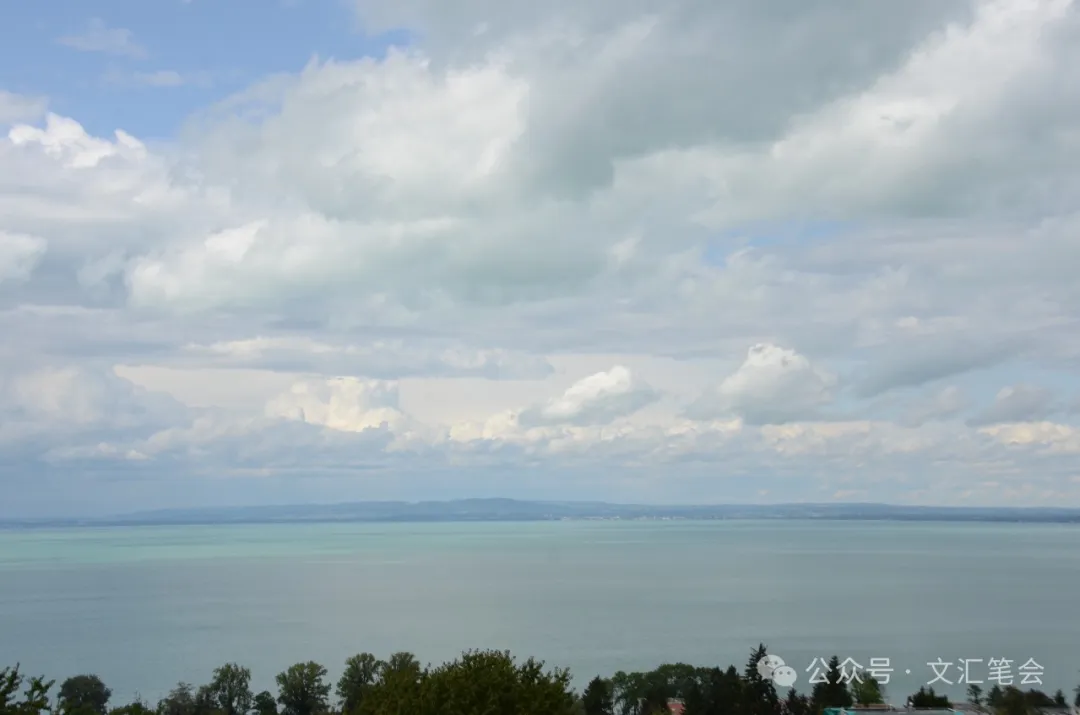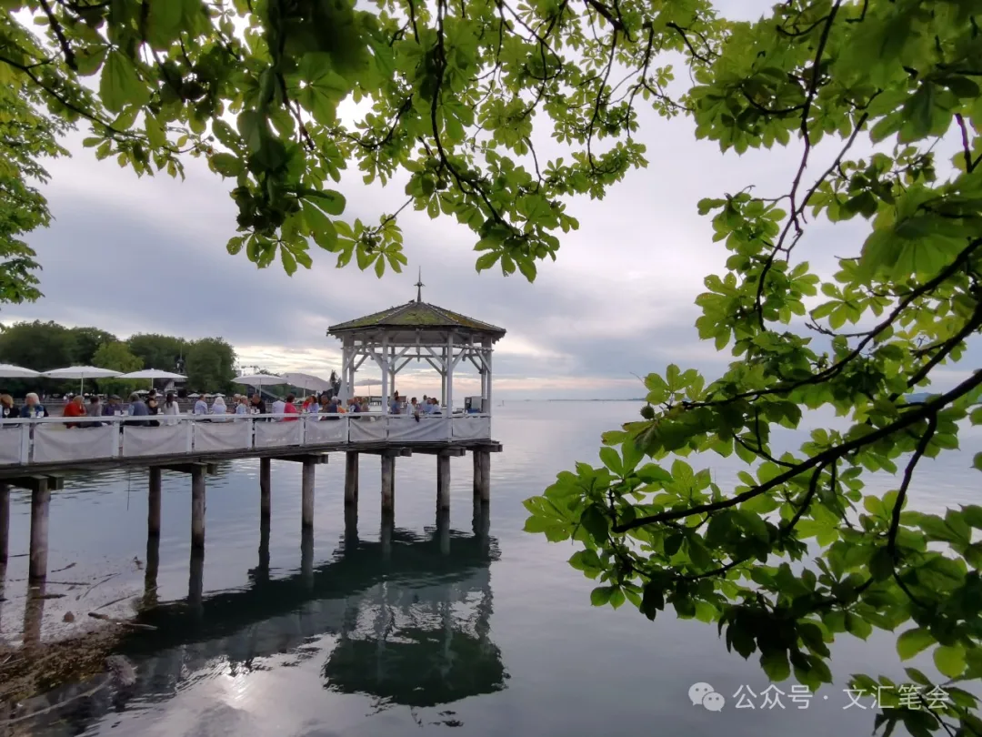 我们继续沿着博登湖信步走去,不知不觉已绕着湖,到了火车的下一个站点,环湖游轮的码头。湖面更显开阔,像海平面一样一览无遗。湖畔有许多绿色长椅,沿湖有长长的多级台阶,当地人称为“落日台阶”,据说是观日落的最好景点。我看表,指针指向六点半,根据当地的气象预报,今天落日为九点零五分,于是我们买了汉堡包和饮料,安心坐在台阶上,观赏了大自然上演的另一场“壮演”。