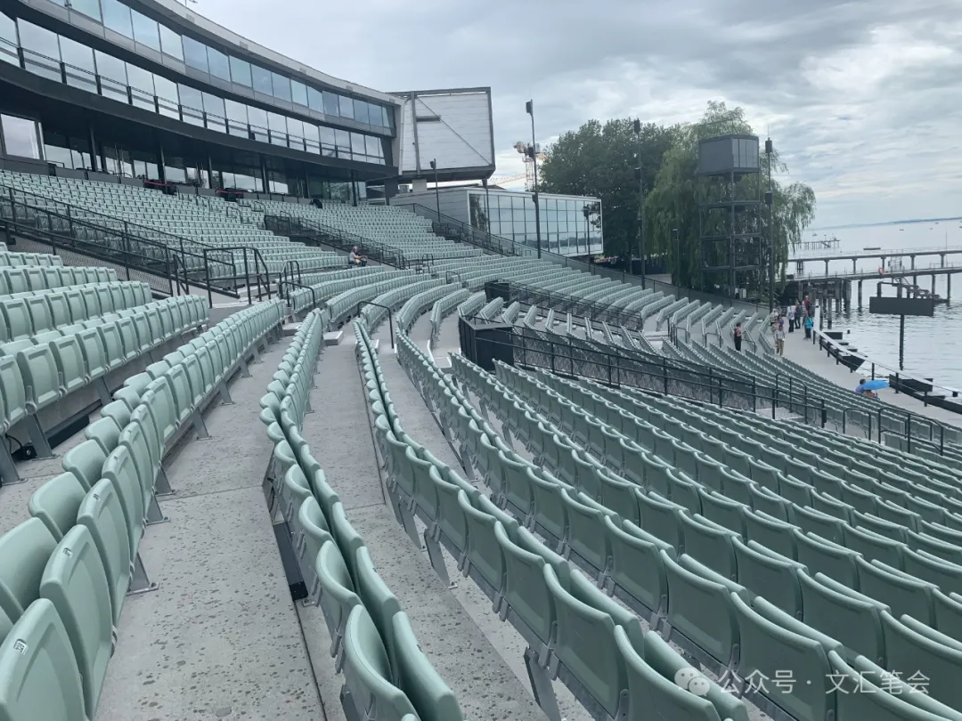 既然千里迢迢来到奥地利,总想多见识一下。翌日下午,我再次坐火车去布雷根茨。当日艳阳高照,火车又在昨晚观演处靠站。从车站出来,没想到昨晚演出歌剧《蝴蝶夫人》的湖畔剧场竟然敞开着,可以随意进去参观。昨晚光顾着观演,没有好好考察这座不平凡的剧场。我踱进剧场,从不同角度观察舞台,原来那张轴卷似的纸张舞台,背面有巨大的后台,所以演员进出有充分的回旋余地。观众席的濒水处有很粗的围栏,围栏上图文并茂地详细描绘了搭建舞台的过程。