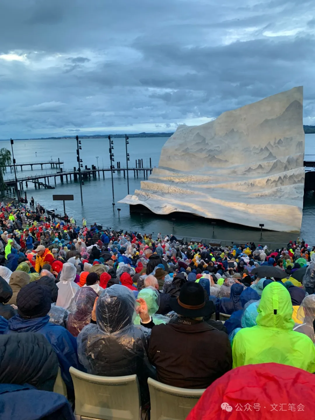 演出是晚上九点一刻开始,大概是为了等天色完全暗下来,以便水上露天剧场运作。巨大的候场大厅里面挤满了人。当天飘着雨,许多观众都披着雨衣,各种色彩的雨衣组成斑斓的图画。还有许多老人盛装出席,男士西装革履,女士是晚礼服。候场大厅里还可以看到敞开大门的艺术节剧场,这是布雷根茨艺术节发达以后建造起来的大剧院,红丝绒的座椅可容纳将近1700位观众。照理说,这应该成为艺术节的主演剧场,但是从创办开始的传统并未改变,湖面上的剧场还是艺术节的主阵地。当晚为歌剧《蝴蝶夫人》伴奏的交响乐团是享誉世界的维也纳爱乐乐团,平时的专场演奏也很火,而现在只是作为歌剧伴奏,就在这个艺术节大剧院里演奏,通过视频连线呈现给现场观众。