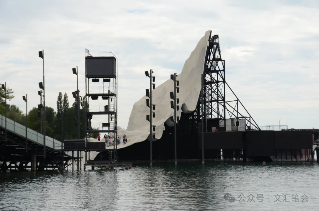 我后来了解到,布雷根茨是座小城,只有三万人口,但每年艺术节可以吸引二十多万人次。布雷根茨艺术节经过七十多年的发展,目前已经拥有水上舞台(6980个座位,下图)、节日歌剧院(1656个座位)、工作坊剧院(1563个座位)、湖畔前厅(168个座位)、湖畔演播室(330个座位)、公园演播室(220个座位)、福拉尔贝格州立剧院(502个座位)、布雷根茨美术馆剧院(150个座位)、宇宙剧院(166个座位)等九个大小不一的演出场地,总计可以容纳11735名观众。试想如果艺术节举办一个月,可以有多少观众受益。