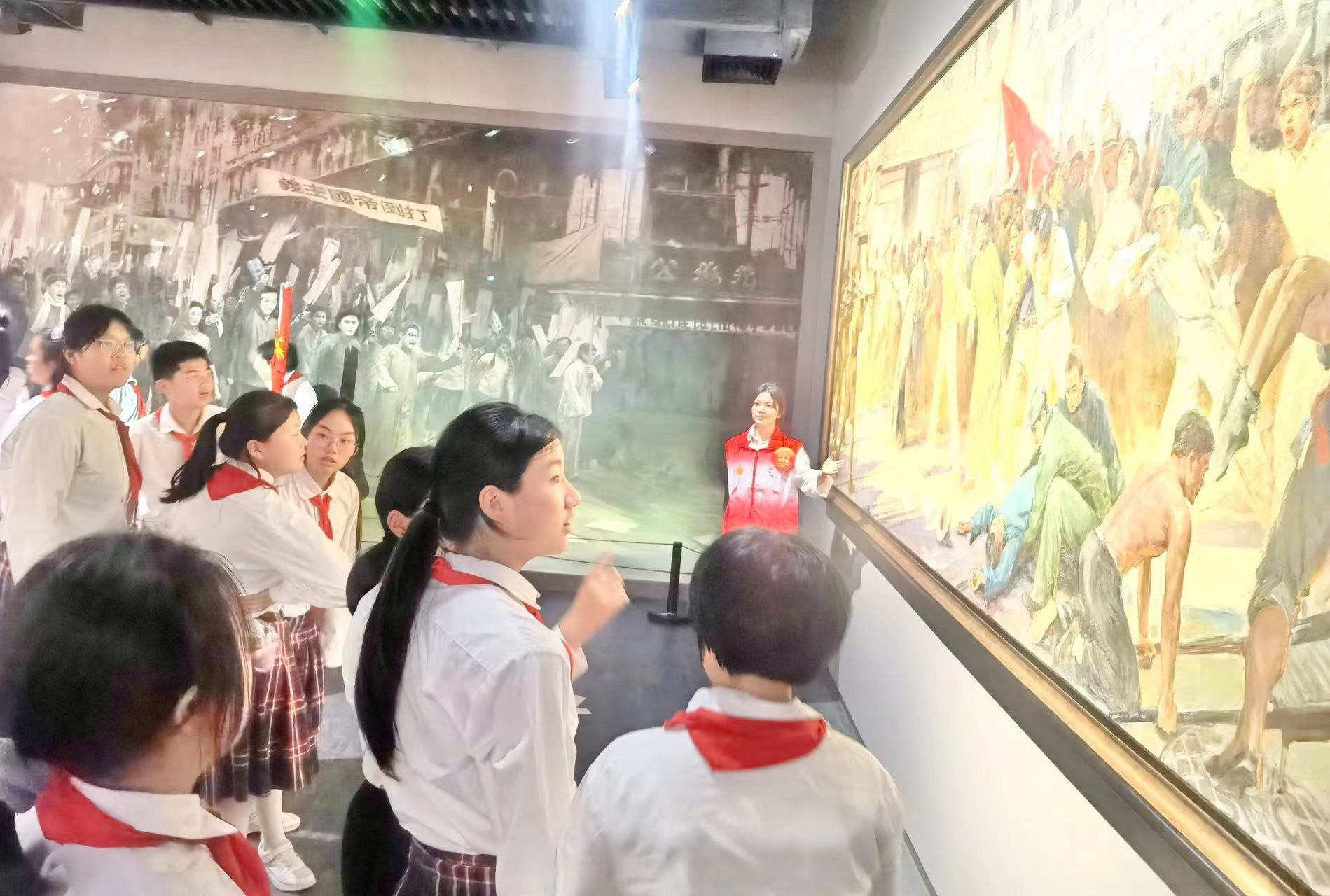 在第二展厅,油画《南京路上的五卅惨案》是本次红色工运艺术课重点讲述的艺术作品,这幅由中国油画届大师、中国美术学院著名教授全山石创作的大幅现实主义题材的油画作品,展现的1925年5月30日当天下午,南京路上游行示威的工人和学生与英租界巡捕之间激烈对抗的情景。虽然画面中的人物并未指向哪个历史人物,但在五卅运动中前仆后继的革命志士的群像却呼之欲出。