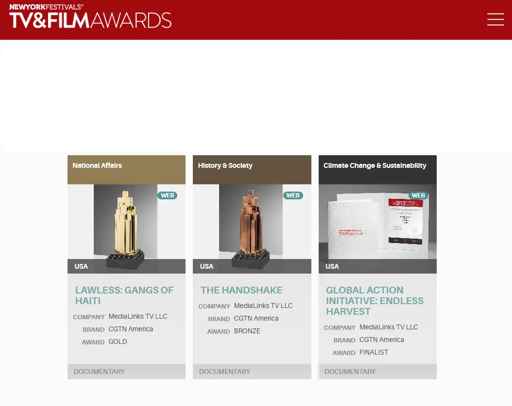 截至目前,CGTN北美分台原创电视和新媒体作品已累计荣获“纽约国际电影电视节奖”“泰利奖”“白宫摄影奖”“信号奖”“号角奖”等226个国际奖项。