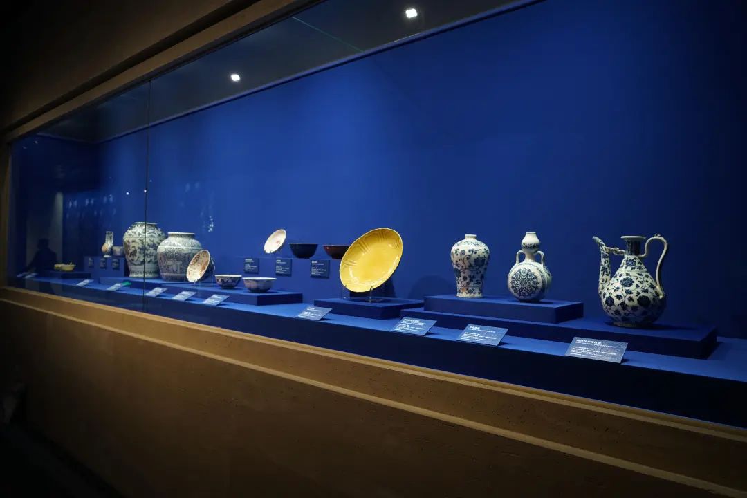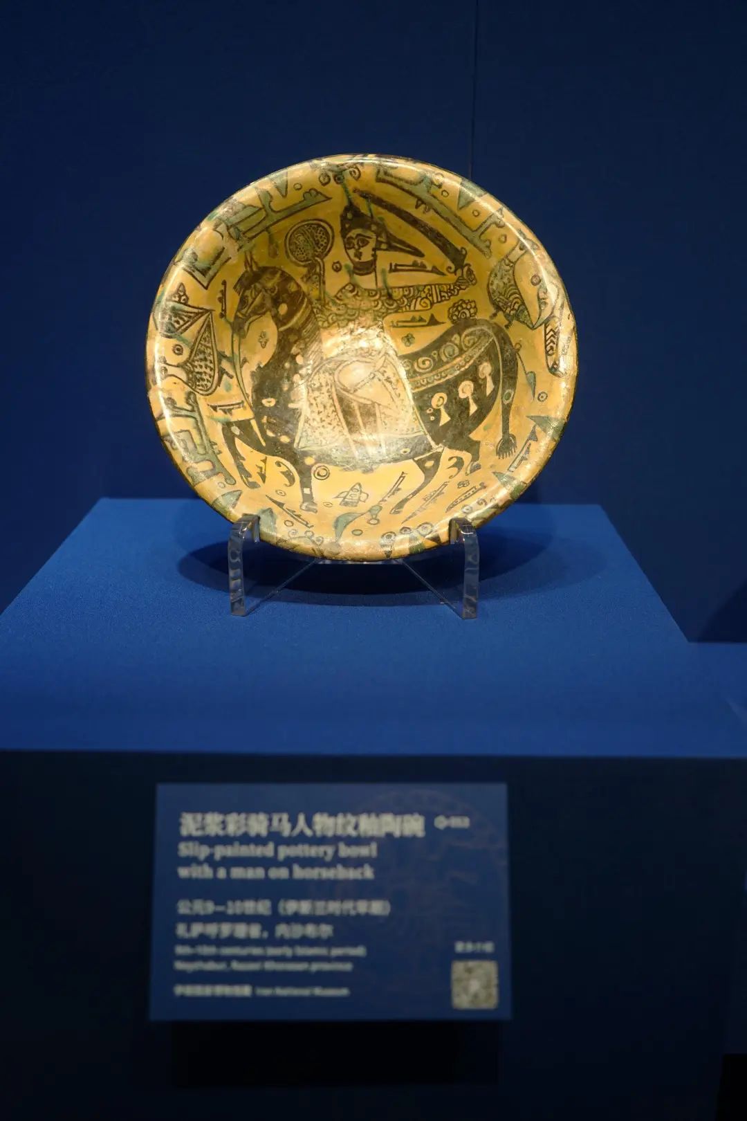不仅是联珠对鸟纹锦,“信仰艺术”版块展出的多件文物,也是当时中国与伊朗交流往来密切的佐证。“位于伊朗西北部的阿尔达比勒市,是伊利汗王朝时期重要的中心城市。当地有座非常宏伟的清真寺,里面有间瓷屋,是专门放置从东方购置的大量瓷器,瓷器上印有‘徽’字,证明在14世纪,伊朗和中国保持着物质上频繁的往来。”