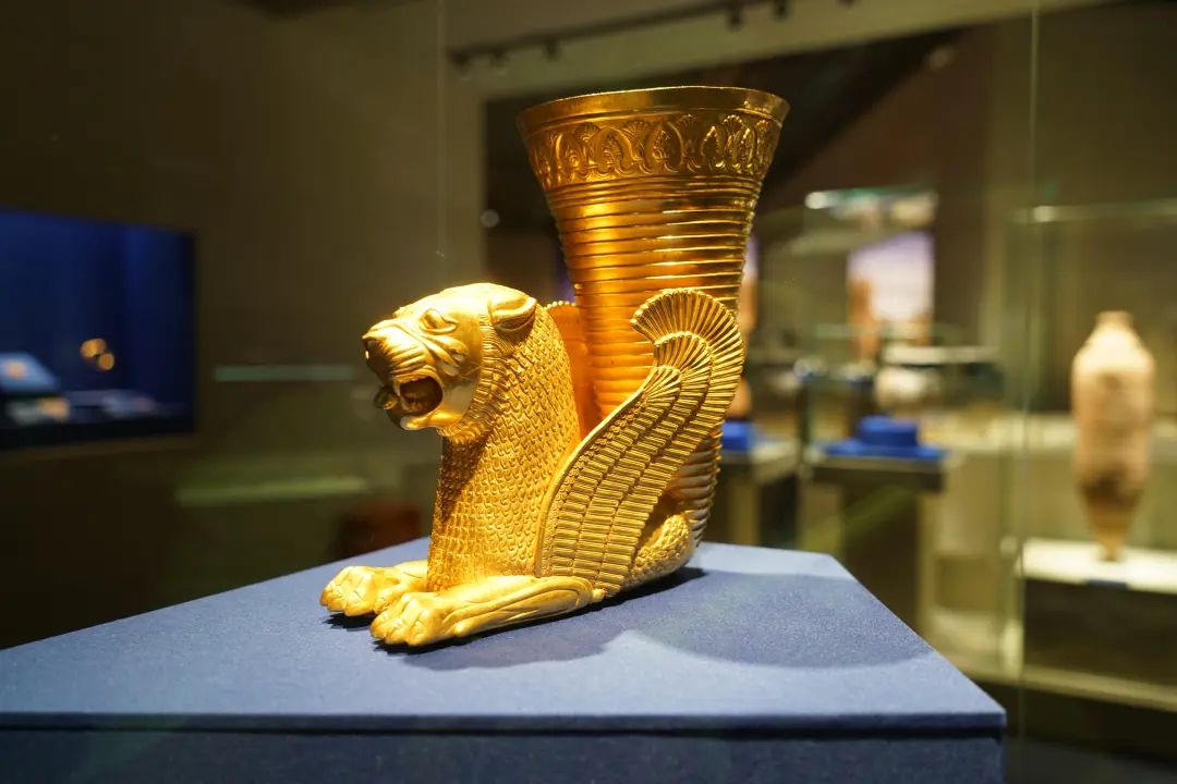 “辉煌时代”版块就全面呈现了这一时期伊朗出彩的文化面貌。例如来自哈马丹省的有翼狮金来通,结合了有翼的狮身和近乎锥形的垂直杯身,杯身上端饰有一圈莲花图案,其下饰有平行的凹槽线。狮子呈张嘴伸舌状,头部、颈部和胸部覆有鬃毛,前爪自然着地。双翅末端饰有三排羽状花纹,末端向前弯曲。