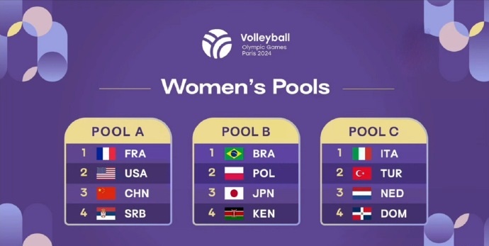 巴黎奥运会12支女排参赛队被分成三个小组,每组四队。B组为巴西队、波兰队、日本队和肯尼亚队,C组为意大利队、土耳其队、荷兰队和多米尼加队。根据规则,奥运会女排小组赛阶段采用单循环赛制,三个小组的前两名和两个成绩最好的第三名晋级八强淘汰赛。