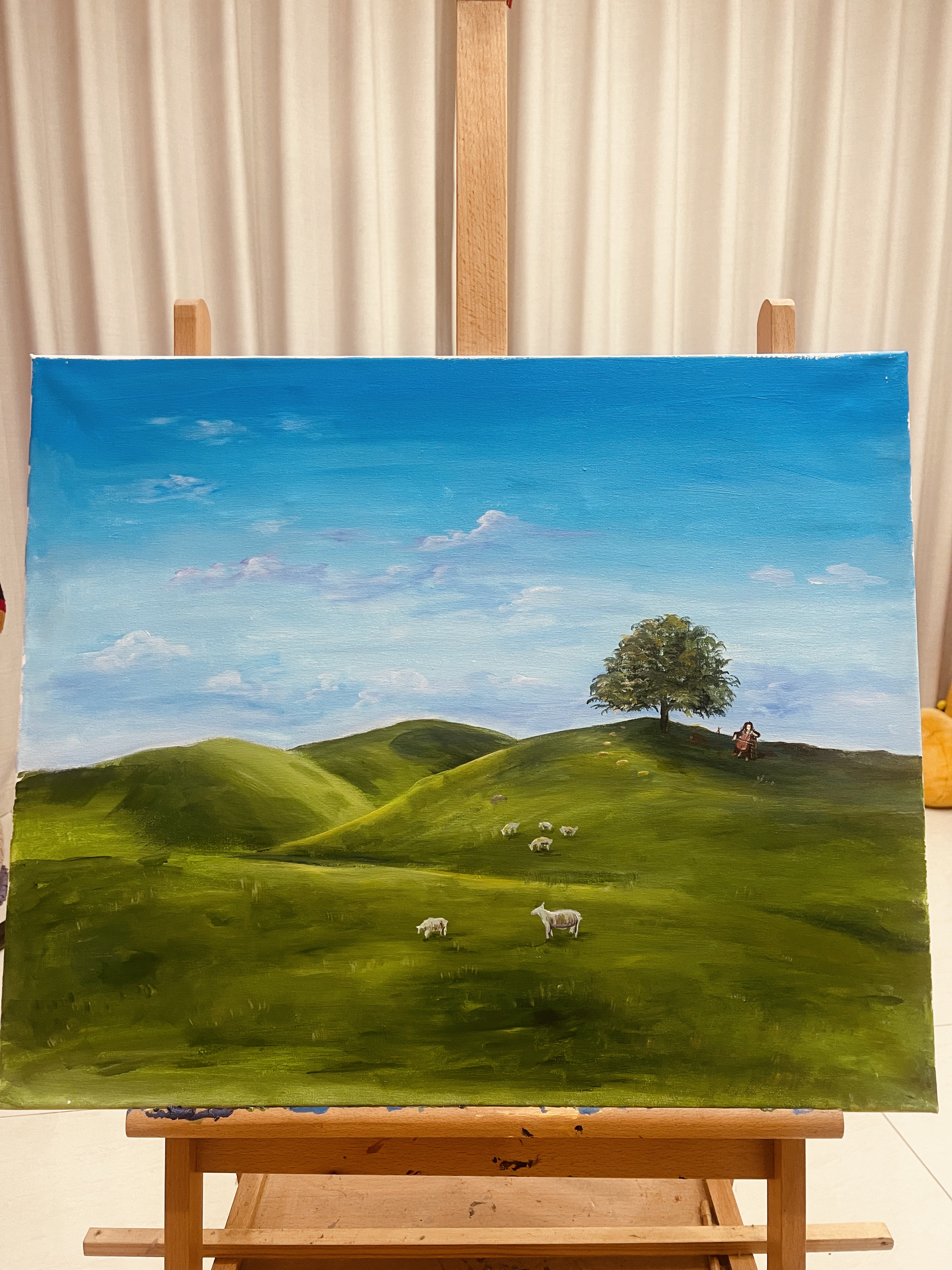 常菲目前在上音附中主修大提琴,现师从于大提琴家李继武教授,同时她也向作曲家李博禅副教授学习作曲,女孩已经积累了近十首自己的原创作品。就在不久前,常菲同样在上海音乐厅“音乐午茶”的舞台,演奏了她谱写的颇具蒙古风情的作品《草原四季》,表达了她心中对草原春夏秋冬的印象,这首作品也获得了观众席里不少听众的喜爱。常菲不仅会作曲,平时也爱画画,在创作《草原四季》的旋律时,她也画了一幅画——绿色的大片草原上方是蔚蓝的天空,画面中景处出现了散落的羊群,而在远景处有一棵茂盛的树,树下有个女孩在演奏大提琴。