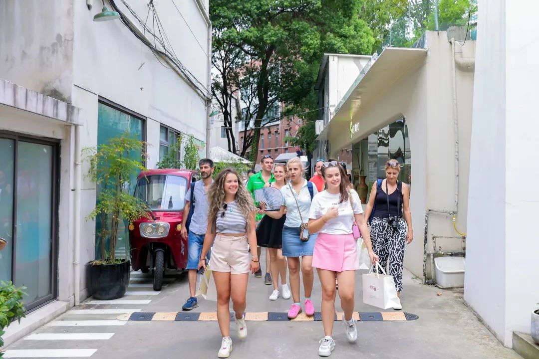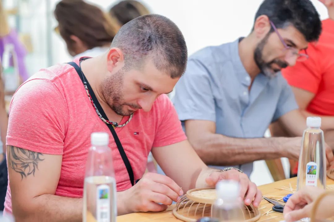 在苏州河边的M50创意园区,舞蹈团成员们被这里丰富缤纷的艺术工作室和浓郁的艺术氛围所吸引。在艺助行,他们更是在上海市工艺美术大师、普陀区非遗项目竹丝编代表性传承人程丽的指导下,亲手体验了竹编的乐趣,对竹蜻蜓、竹编画等作品赞不绝口。此外,他们还逛了充满人间烟火气与精致海派味的鸿寿坊市集,品尝了上海的地道美食,亲身感受到了上海市民游客的日常休闲生活。