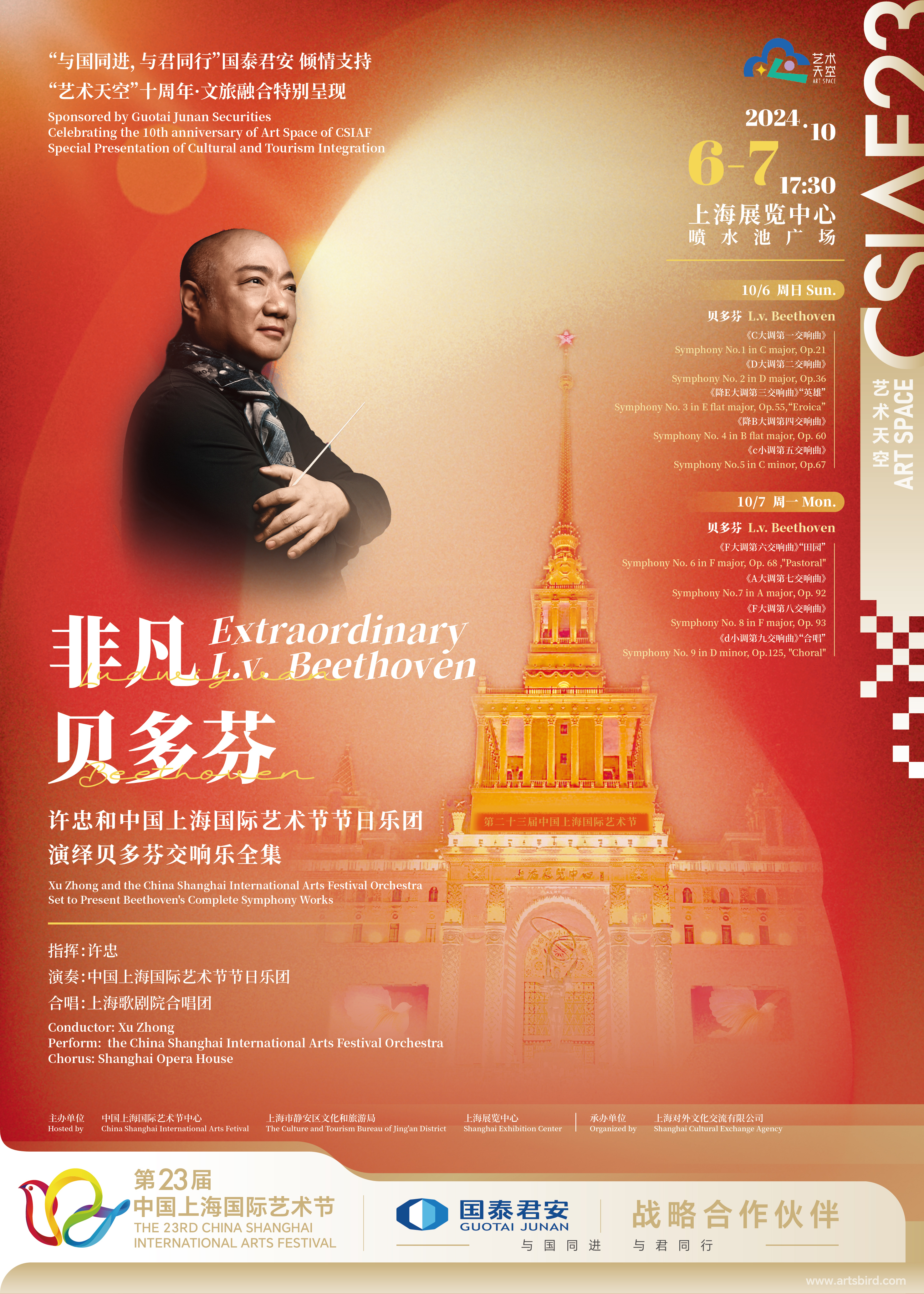 10月6日至7日,“与国同进 与君同行”国泰君安倾情支持 第二十三届中国上海国际艺术节“艺术天空” 十周年·文旅融合特别呈现 “非凡贝多芬”——许忠和中国上海国际艺术节节日乐团演绎贝多芬交响乐全集将以激情旋律点亮上海展览中心。该演出由中国上海国际艺术节节日乐团献演,上海歌剧院院长、著名指挥家、钢琴家许忠执棒,共同奏响贝多芬第一至第九交响曲,将古典乐经典的高质量演绎融入城市背景,打造独一无二的户外景观演出,为本届艺术节“艺术天空”系列演出启幕。