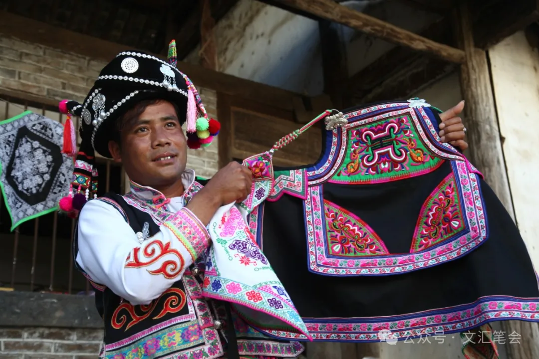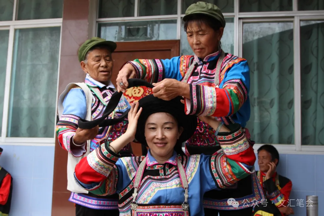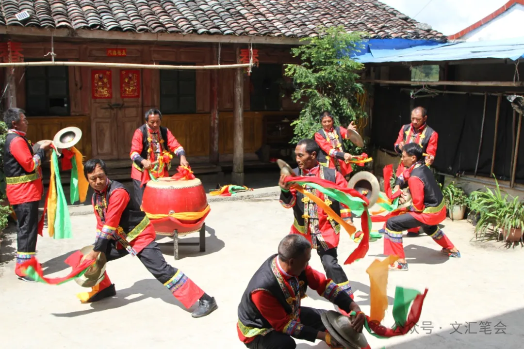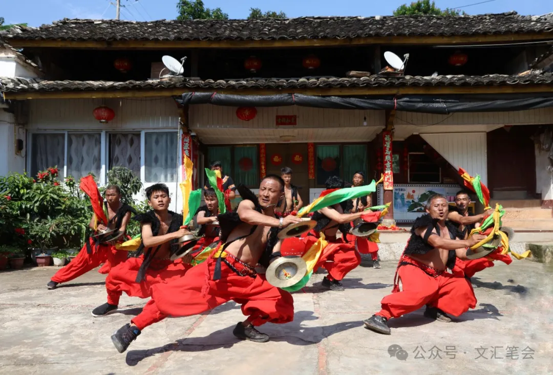 今年8月,我们去联合村绿竹寨。才进村口,就听到了铿锵激越的擦钹声,充满了大山的苍茫。是祁晓龙,带着他的团队早早就在路口那棵巨大的榕树下等候了。他的团队成员最小的17岁,李豪章,还是学生,在保山技师学院读书。他们腾挪跳跃,身形在大鼓的节奏中行云流水,一个民族在大山里的坚守、传承、创造的特质在他们的身上得到极致的体现。舞毕,祁晓龙带着九名彝族汉子斟上自烧的包谷酒,唱着祝酒歌,给我们送上最真挚的祝福。在联合村的10个自然村里,绿竹寨是擦大钹的传统保留得最好的一个村。这要得益于祁晓龙的外公李科。一直以来,绿竹寨的文化生活风生水起,女的跳舞,刺绣打花棍,唱山歌,男的擦大钹,一座大山都被他们搅得云飞雾动。他们像大山的灵魂舞者,把一个民族千百年来积存的勤劳、勇敢、坚韧、智慧,通过擦大钹这一表现形式展现在世人面前。