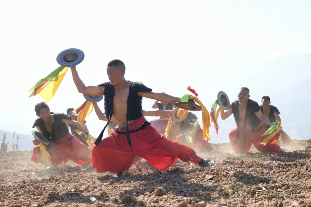 大鼓震动怒山筋脉,长号击穿怒山耳鼓,唢呐拨动怒山心弦,彝族汉子手中的大钹擦响,一座怒山似乎把一条怒江吸进胸膛,热血偾张。汉子们腾挪跳跃,哐擦,哐擦,哐哐擦,天地同语,群峰合唱,一场接一场大地上的舞蹈,就这样完成了季节与季节的交接,完成了自然与人类的授受,更延续了一个民族史诗千百年的守护。