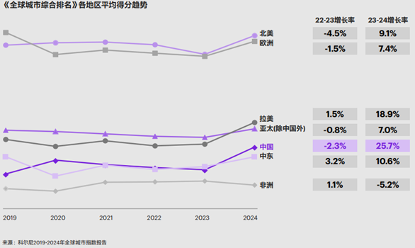 此外,放眼全球,《报告》揭示今年多数地区的得分呈现不同程度的上升,扭转了前几年的下降趋势,预示着新一轮全球互联互通与交流浪潮的兴起。从全球分地区得分变化来看,中国、拉美、中东地区实现10%以上的涨幅,北美、欧洲和亚太等地区得分微涨,而非洲地区呈现轻微跌势。欧洲仍是城市平均得分最高的地区。