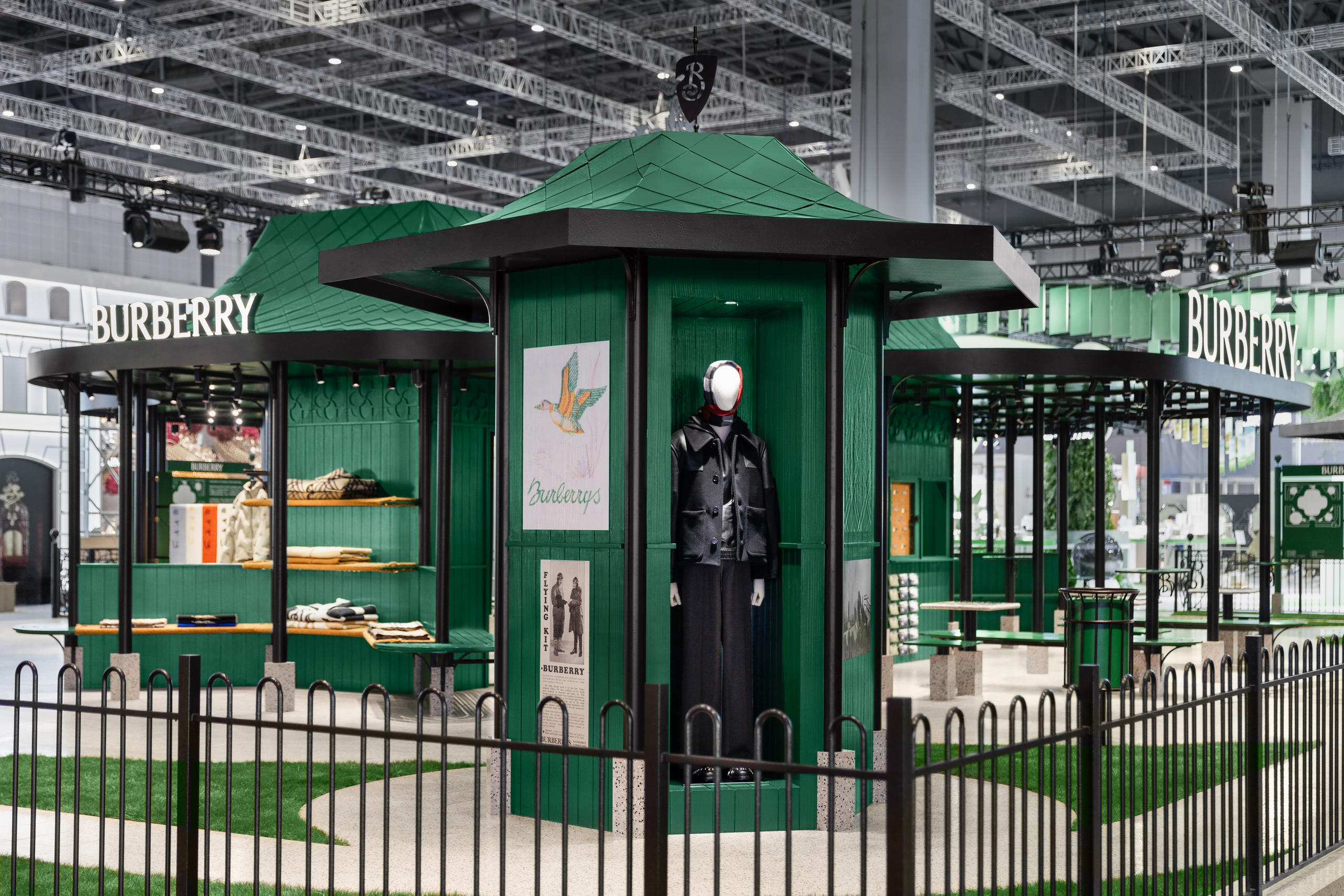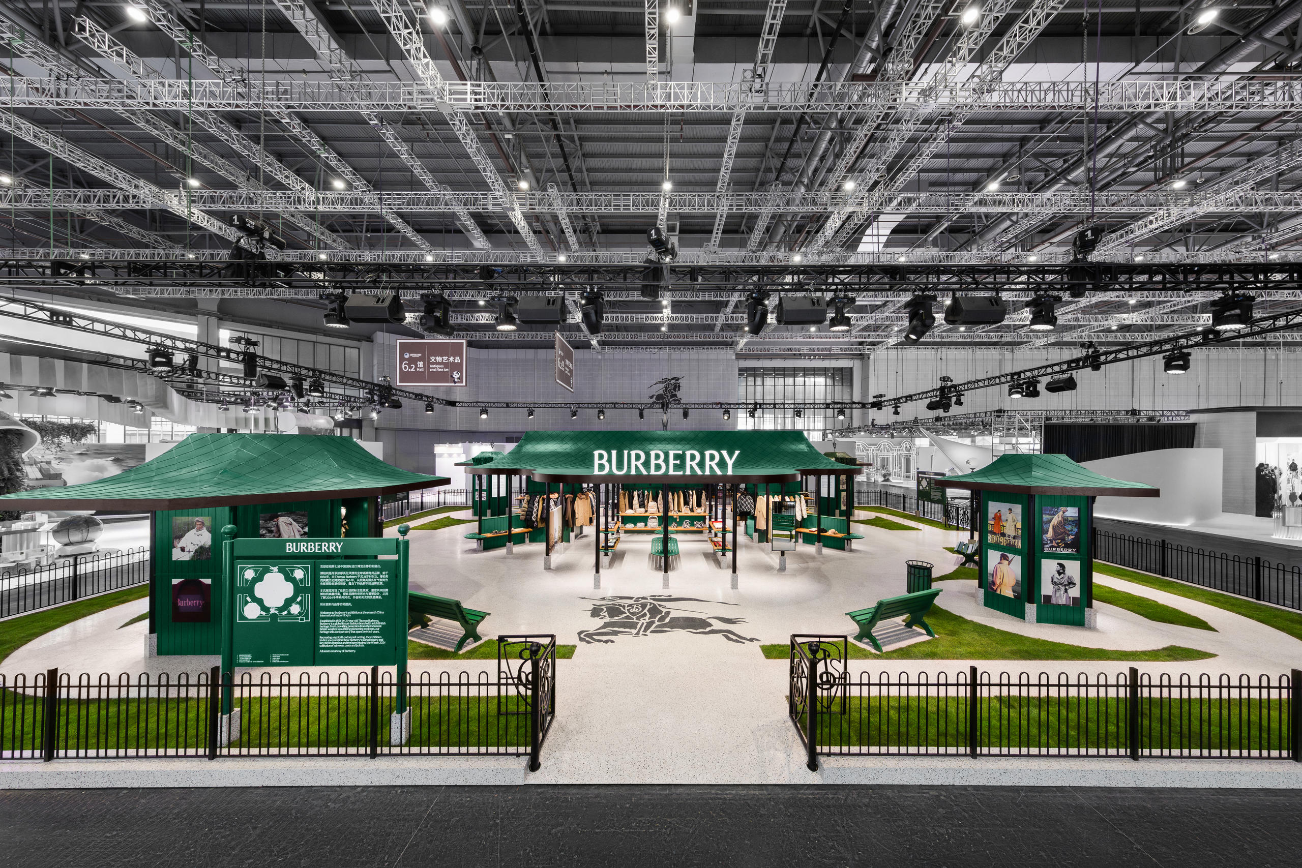 记者在现场看到,博柏利展馆的设计灵感融入传统英伦公园元素,生动重现伦敦公园中的大型凉亭设计。在晴雨不定的英伦天气中,凉亭可为来往行人提供温暖守护,与品牌设计理念不谋而合。此次博柏利展馆也以此为灵感,空间以品牌常春藤绿焕新诠释,礼赞博柏利悠久历史传承。亭子顶部的风向标以博柏利经典的马术骑士徽标铸就。展台内公园风格的长椅、棋盘桌、布告板等都极