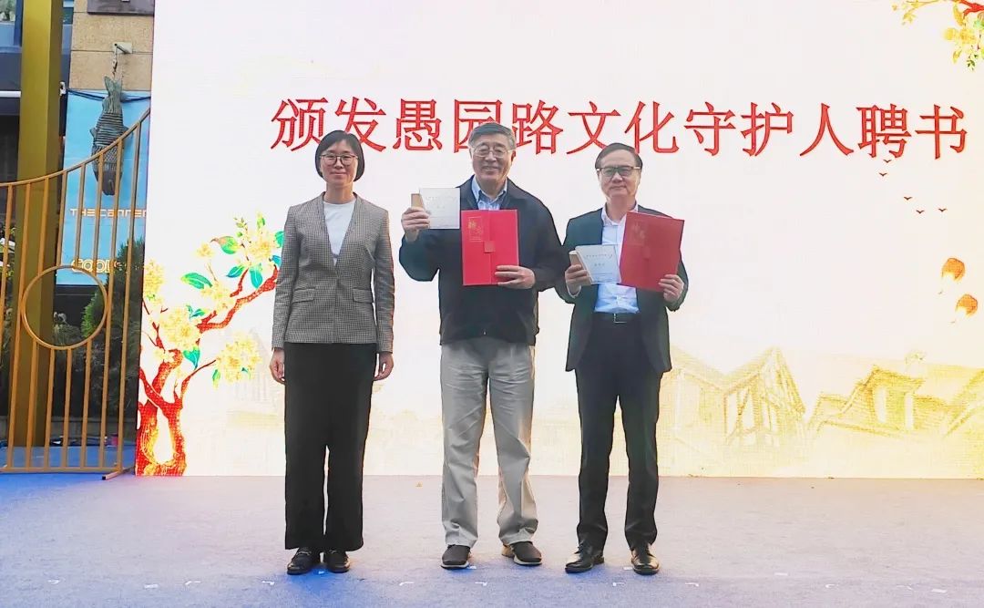 本次活动向上海市社会科学院城市文化创新研究院院长、研究员徐锦江,愚园路红色印记宣讲团核心骨干霍白颁发“愚园路守护人”聘书,表彰他们在讲述愚园路故事中做出的特别贡献。