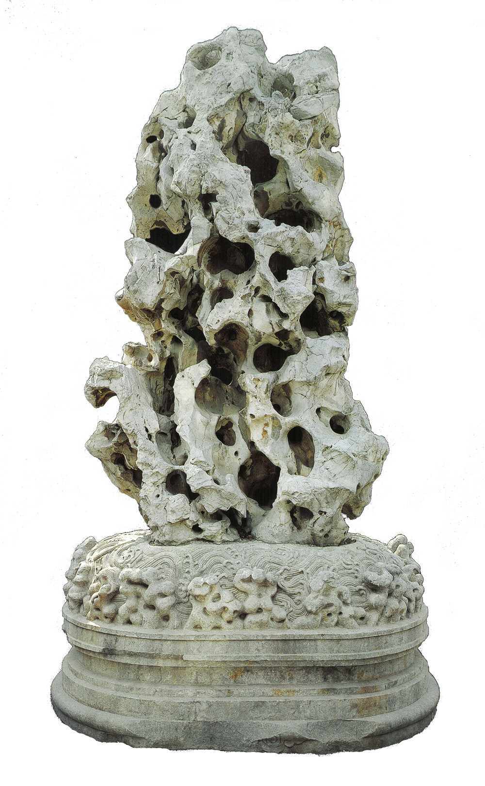 从雕刻神似、惟妙惟肖的玉石山子上,我们看到了真实山水的微缩版本。而在天然去雕饰的古代赏石中,亦可见相仿的原理。明清两代,北京宫廷园林中摆放的诸多太湖石、汉白玉赏石,足以证明赏石“像山”的本质。且说颐和园中著名的太湖石“石丈”,这块三米多高,七窍玲珑的太湖石,取米芾拜石之意,被嵌入突隆的海浪浮雕上,如同海中独立的仙山,邀人登临。