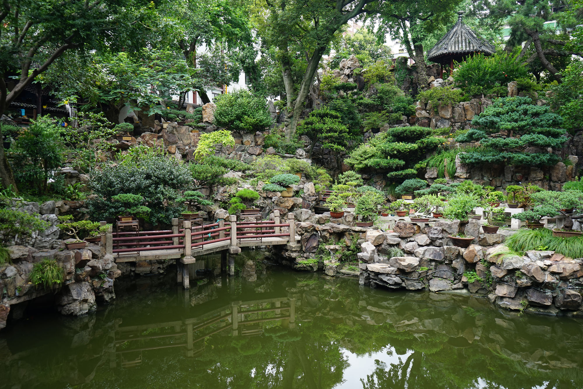 值得一提的是,豫园大假山隔荷花池与小假山“螺丝洞”相对,中间由曲桥相连,如在画中。而在两山间的临水石岸上,还摆放着数盆盆景/盆栽。盆景的意蕴,早在汉代《西京杂记》中便有提及:造出蓬莱诸岛的建章宫太液池西边还有一个池子,名叫“孤树池”。因为“池中有洲,洲上煔(杉)树一株,六十余围,望之重重如盖”。以一株巨树成一景致,又与蓬莱相邻,可见水域环绕中的孤洲独树,同样可以象征海中仙岛。正是这样一种造景观念,赋予了(一株一陶盆的)盆景艺术独特的灵感之源。