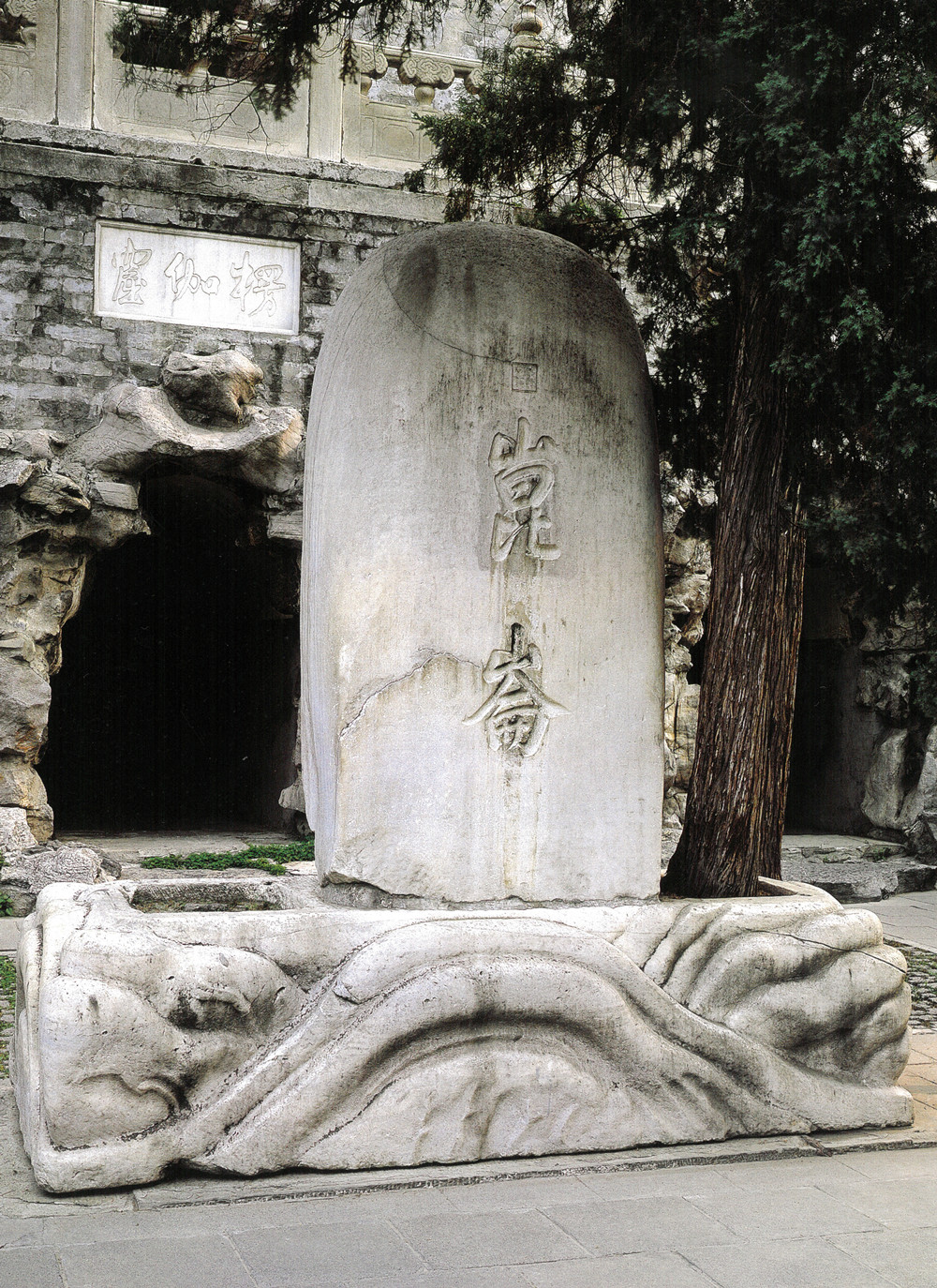 如果眼拙无法将眼前巨石和三山五岳想象到一起也无法,古人还会给出明确提示。北京北海公园永安寺楞伽窟东侧有一块接近两米的汉白玉石。“正面阴刻乾隆御笔‘昆仑’……底座同样为汉白玉石质,饰高浮雕波浪纹”(《御苑赏石》)。生怕观者不解,乾隆帝索性直白“剧透”,眼前这块就是昆仑神山在人间的微缩模型,而赏石之下的波浪纹石座也仿佛被注入了魔法,变成了涌动不歇的大海浪潮。