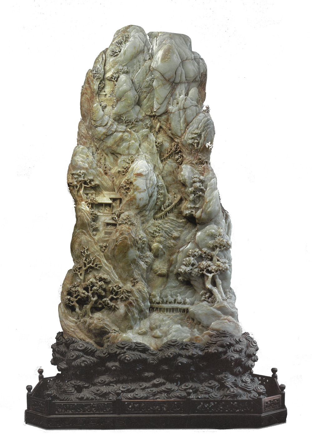 体量如此巨大的山子,亦画亦雕,亦石亦山,宛如一座山峰坐落于同样刻成崇山峻岭的黑檀底座上。加之其本身的治水主题,使之共成为一个山水俱全的微型世界。