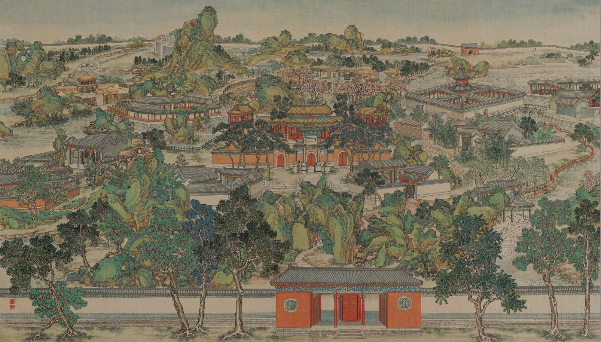 虽然按司马相如《上林赋》的描述,早在汉武帝修建的上林苑中,就已经通过“崇山矗矗,巃嵷崔巍,深林巨木,崭岩参㟥”来体现仙境的幽邃与神秘感,但在清代画家笔下,围绕高耸大主山兴造的怡红院、潇湘馆等亭台楼阁,依然令观者为这个以“石头”为题的故事感到震撼。毫无疑问,正是画面中这满目琳琅的参差层峦,赋予了大观园本身,“金门玉户神仙府,桂殿兰宫妃子家”一般的非凡感官体验。