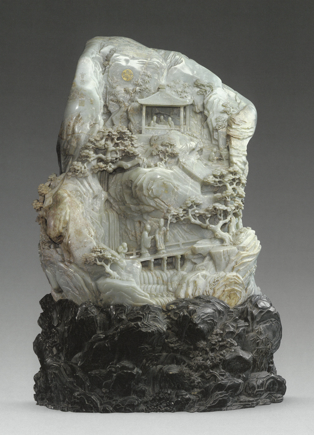 再看故宫收藏的另一件“青玉会昌九老图玉山”,这件山子以接近圆雕技法,将包括白居易在内“会昌九老”在整座玉山上逐一呈现。与同一题材的绘画相比,玉石本身的纹理,使山子更贴近龙门香山本色。而其中浮雕、镂雕结合的木桥、溪流,进一步增添了平面作品所缺少的立体感,使之更为灵动。两件山子作品下方还配有黑檀器座,用云水、巉岩纹饰,凸显了山子的仙境气质。