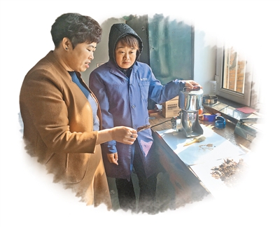 高桂英(左)了解养鹿户鹿产品加工情况。 |