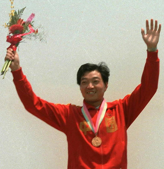 1984年洛杉矶奥运会上,许海峰在获得男子自选手枪项目冠军后领奖(资料照片)。图片来源:新华社