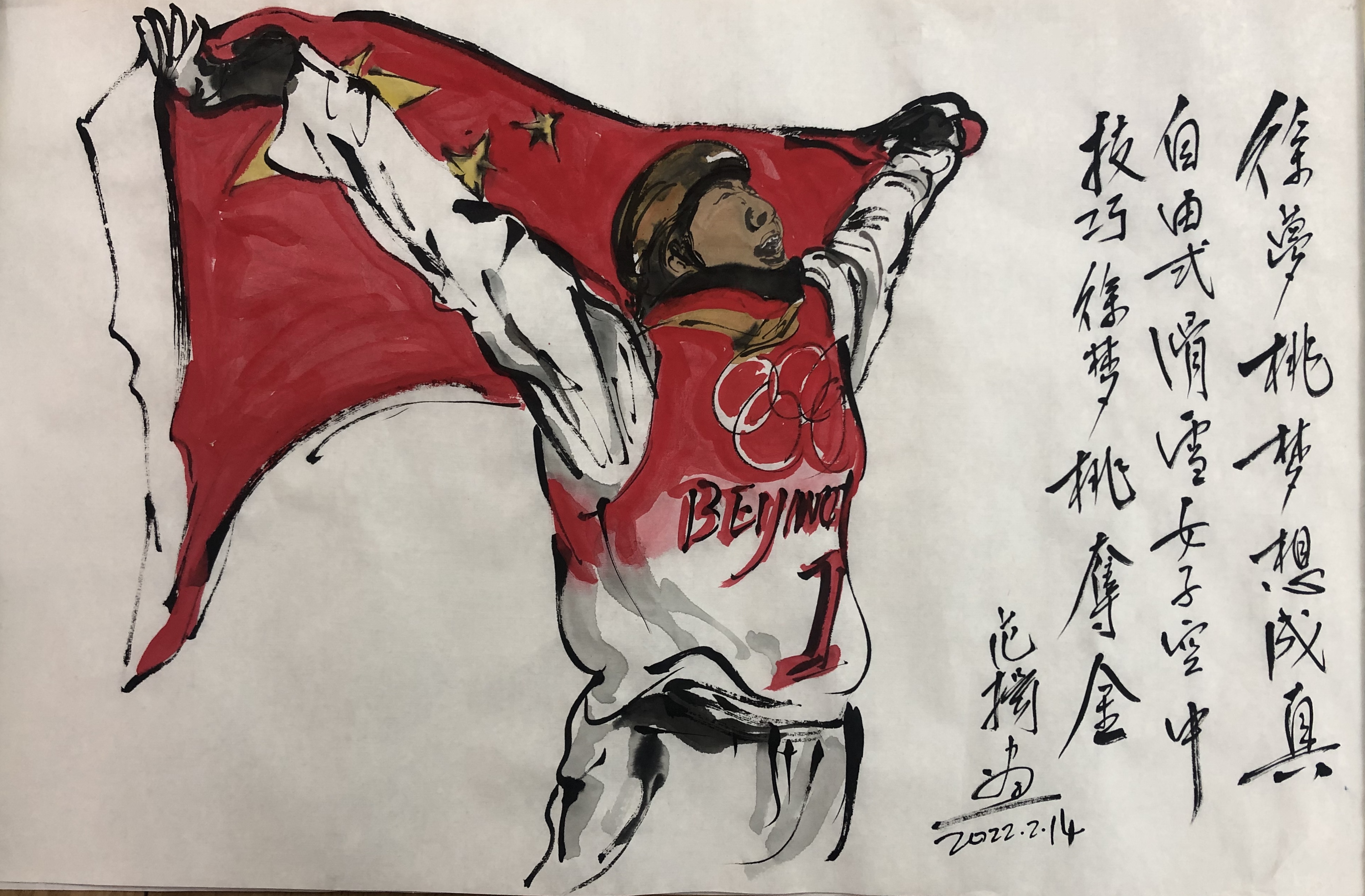 今天傍晚,在冬奥会自由式滑雪女子空中技巧决赛中,我国选手徐梦桃金牌。著名书画大家范扬先生当即将徐梦桃夺冠后高举国旗的时刻绘写了下来。