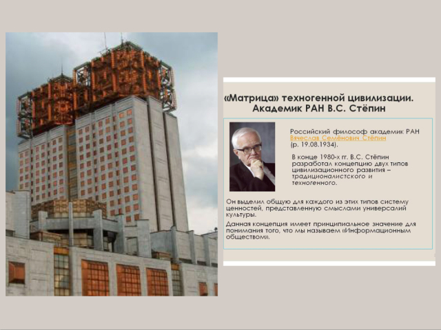 哲学的结构预测功能清楚地体现于社会发展的根本变革时期和新型文明发展的形成时期。近三十年来我在自己的著述中已经证明:人类已经进入了一个新的彻底变革的时期,将会出现一个调节人类生活实践的新型价值系统(精神性模型)。就彻底转型的程度而言,该时代可以与“传统类型的发展向技术类型的发展的转变”相比较。但是,如果第一阶段的转型持续了一个世纪,那么在当前的条件下,转型将会加速进行。