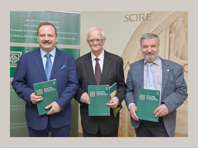 2015年,斯乔平(中)出席《哲学,方法论和科学史》杂志发布会