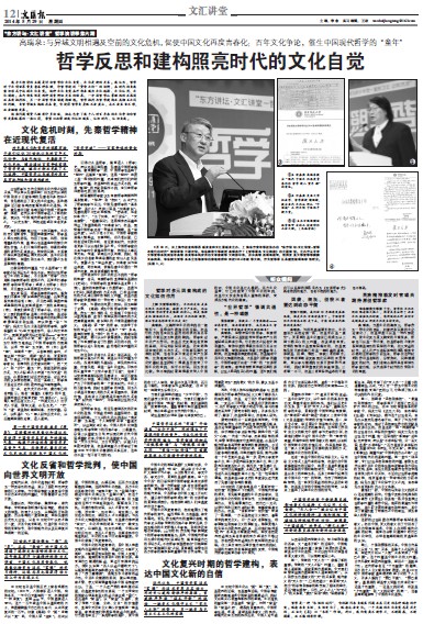 我今天演讲的主题是讨论哲学和文化自觉、文化更新的关系。我认为,哲学对于文明世界背负着某种承诺,即哲学透过“贤智之伦”的论辩,在时代的自我意识形式中达到文化自觉。这种文化自觉在外部表现为文化选择、文化认同、文化创造;在内部实际是两种因素辩证关系的结果:一方面哲学从事理性的反思因而具有批判性,另一方面哲学应该建构理想。哲学批判与哲学建构及其相互之间的纠缠,自哲学诞生起就存在着,它使得哲学自身既不会废止,也不会至当不移,而会继续发展。